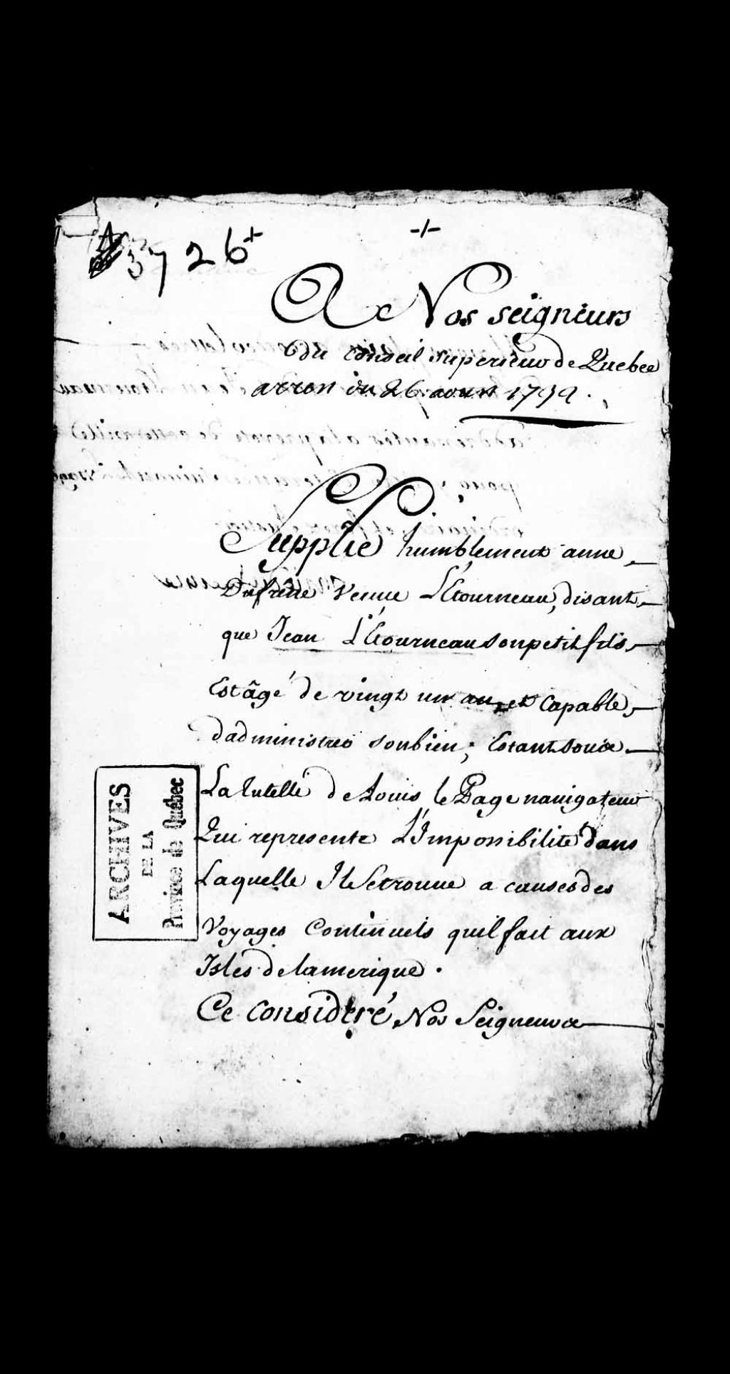 Requête de Anne Dufresne, veuve du sieur Létourneau, au nom de son petit-fils, Jean Létourneau (Letourneau), âgé de 21 ans, est actuellement sous la tutelle de Louis Lepage, navigateur; en vertu de l'impossibilité dans laquelle ledit Lepage se trouve en raison de ses voyages continuels aux îles de l'Amérique, la suppliante demande lettres d'émancipation et de bénéfice d'âge audit Jean Létourneau, [avant le 26 août 1732], Archives nationales à Québec, Collection Pièces judiciaires et notariales, (03Q,TL5,D3726).