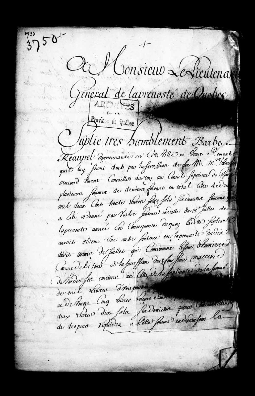 Requête de Barbe Riopel (Réaupel), demeurant à Québec, à l'effet qu'il lui serait dû par la succession de feu maître Charles Macard, vivant conseiller du Roi au Conseil supérieur de Québec, une somme de 2230 livres 16 sols 6 deniers, selon la sentence ordonnée le 13 juillet 1733, et une autre sentence, en date du 10 juillet 1733, condamnant le sieur Dunière, comme débiteur de ladite succession, à verser à la suppliante la somme de 2230 livres 16 sols 6 deniers; demandant que la sentence du 10 juillet 1733 soit exécutée selon sa forme et teneur, 26 août 1733, Archives nationales à Québec, Collection Pièces judiciaires et notariales, (03Q,TL5,D3750).
