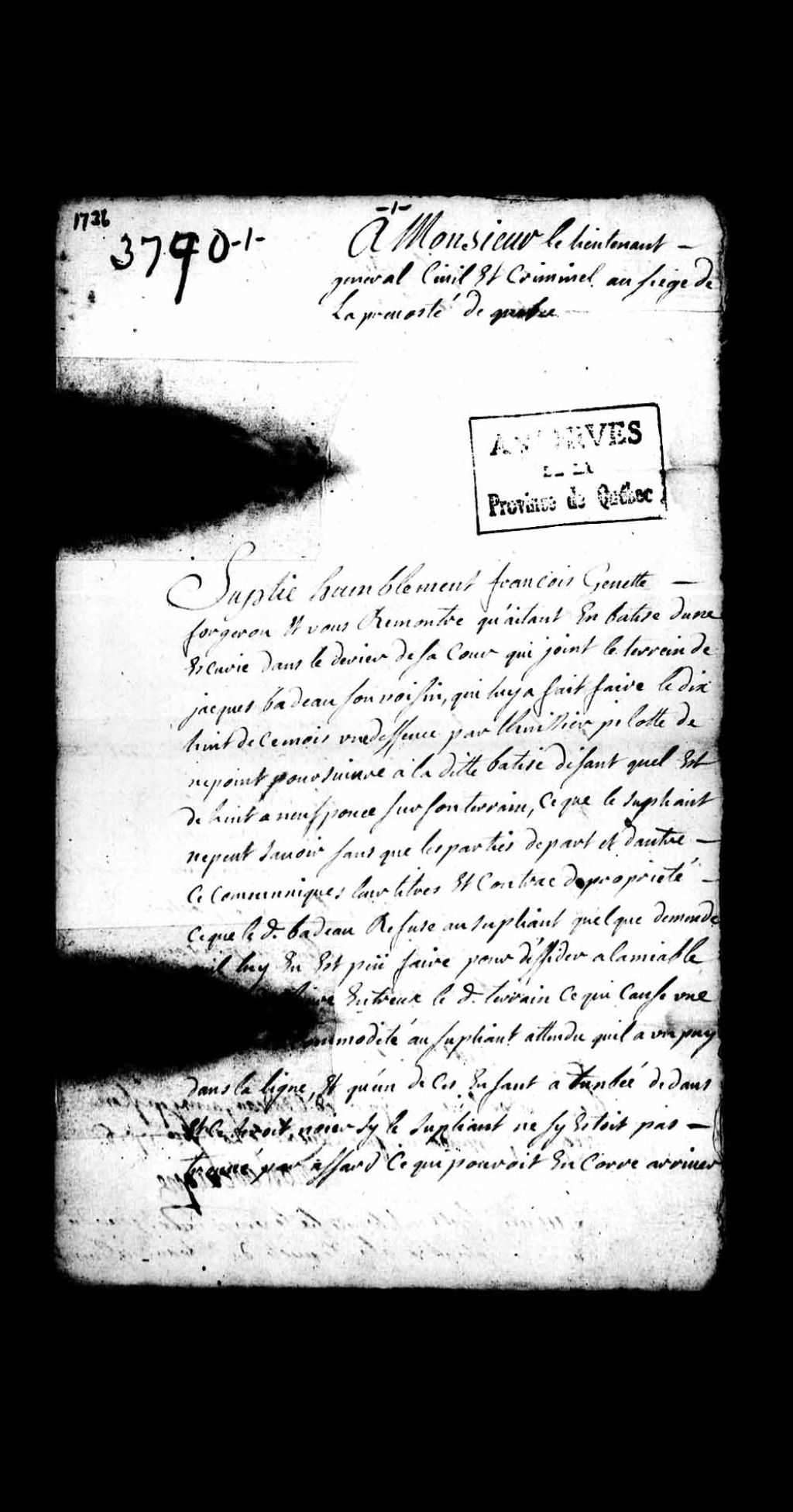 Requête de François Guénet (Guenet), forgeron, à l'effet que son voisin, Jacques Badeau, lui a fait faire défense par huissier de mener à terme la construction d'une écurie, étant donné que ladite bâtisse déborderait de 8 à 9 pouces sur le terrain dudit Badeau; demandant l'assignation dudit Badeau pour qu'il soit ordonné de présenter ses titres et contrats de propriété du terrain; demandant également la nomination d'un expert pour délimiter le terrain de chacun, 20 septembre 1736, Archives nationales à Québec, Collection Pièces judiciaires et notariales, (03Q,TL5,D3790).