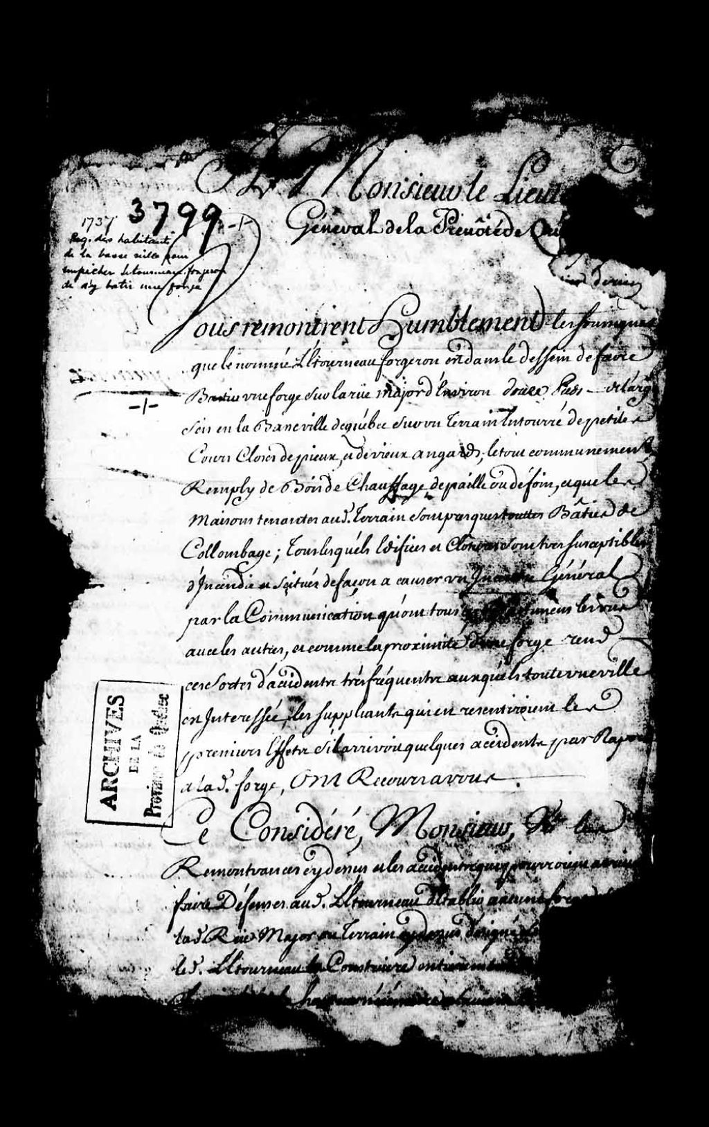 Requête des habitants de la Basse-Ville de Québec, à l'effet qu'ils souhaitent empêcher le nommé Létourneau (Letourneau), forgeron, de se bâtir une forge sur la rue Major, en Basse-Ville de Québec, étant donné les énormes risques d'incendies entraînés par la proximité des édifices et clôtures; demandant l'assignation dudit Létourneau pour qu'il lui soit fait défense de construction, sous peine d'amende ou de démolition desdits bâtiments