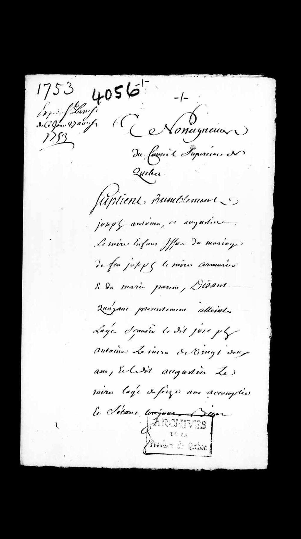 Requête de Joseph-Antoine Lemire, âgé de 22 ans, et Augustin Lemire, âgé de 16 ans, tous deux enfants de feu Joseph Lemire, armurier, et de Marie Parent, demandant lettres d'émancipation et de bénéfice d'âge pour jouir de leurs biens meubles et du revenu de leurs immeubles, [Avant le 27 août 1753], Archives nationales à Québec, Collection Pièces judiciaires et notariales, (03Q,TL5,D4056).