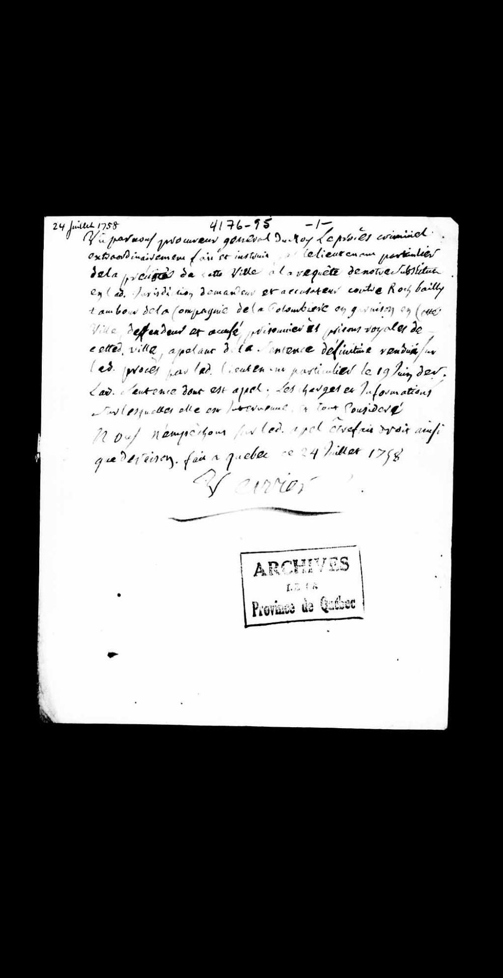 Conclusions du procureur général du Roi au Conseil supérieur de Québec, Louis-Guillaume Verrier, sur l'appel de la sentence définitive du 19 juin 1758, rendue dans le cadre du procès criminel extraordinairement fait et instruit par le lieutenant particulier de la Prévôté de Québec, contre Roch Bailly, tambour de la compagnie de la Colombière, en garnison en cette ville, accusé du vol de 12 mouchoirs et d'un rasoir dans une chambre du château Saint-Louis et appelant, 24 juillet 1758, Archives nationales à Québec, Collection Pièces judiciaires et notariales, (03Q,TL5,D4176-95).