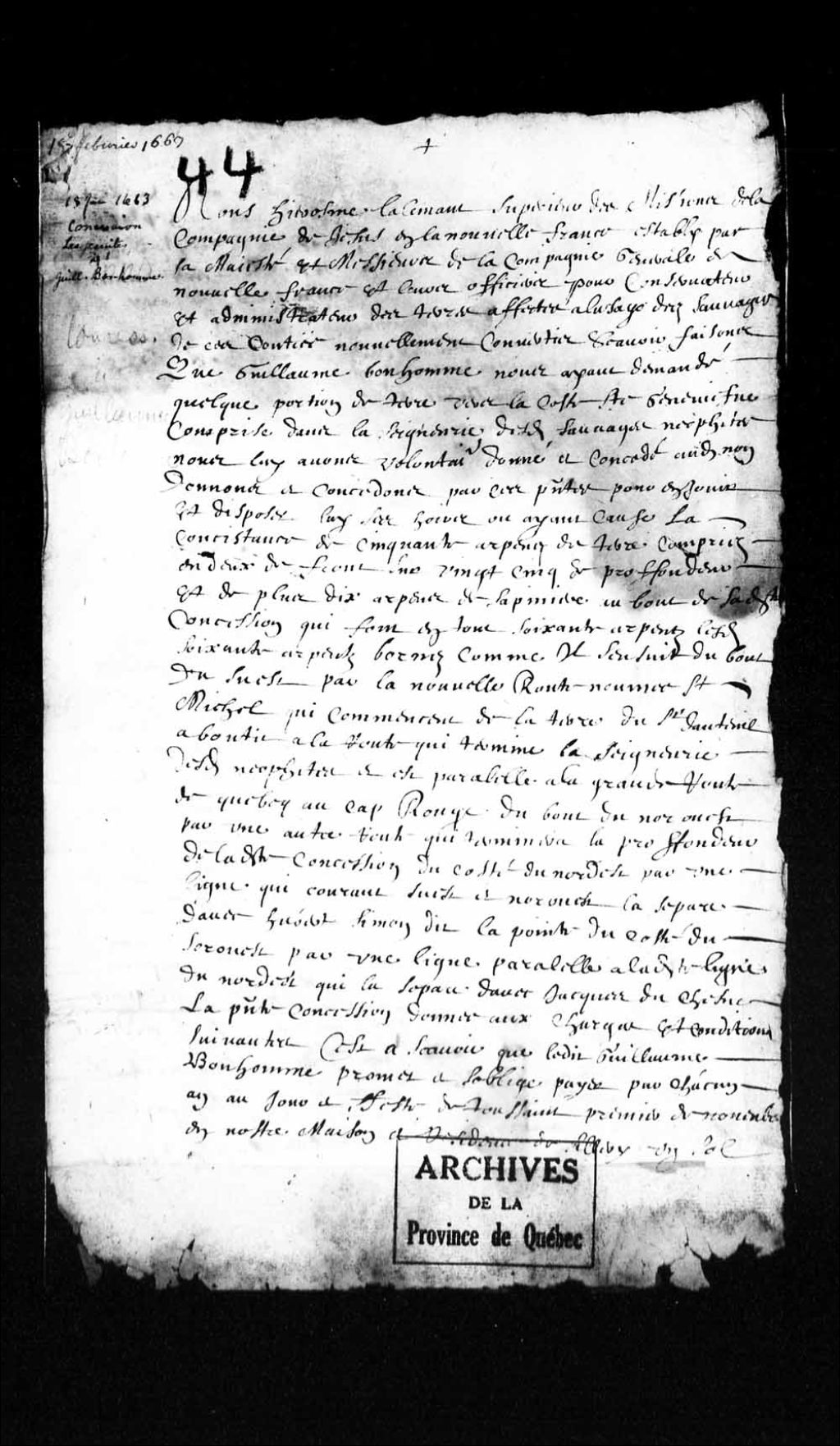 Concession d'une terre en la côte Sainte-Geneviève par Jérôme Lalemant, supérieur des Missions la Compagnie de Jésus en Nouvelle-France (Jésuites) à Guillaume Bonhomme, de cinquante arpents de terre (deux de front sur vingt cinq de profondeur) et de plus dix arpents au bout de la dite concession, en tout soixante arpents, près de la route Saint-Michel, 18 février 1663, Archives nationales à Québec, Collection Pièces judiciaires et notariales, (03Q,TL5,D44).