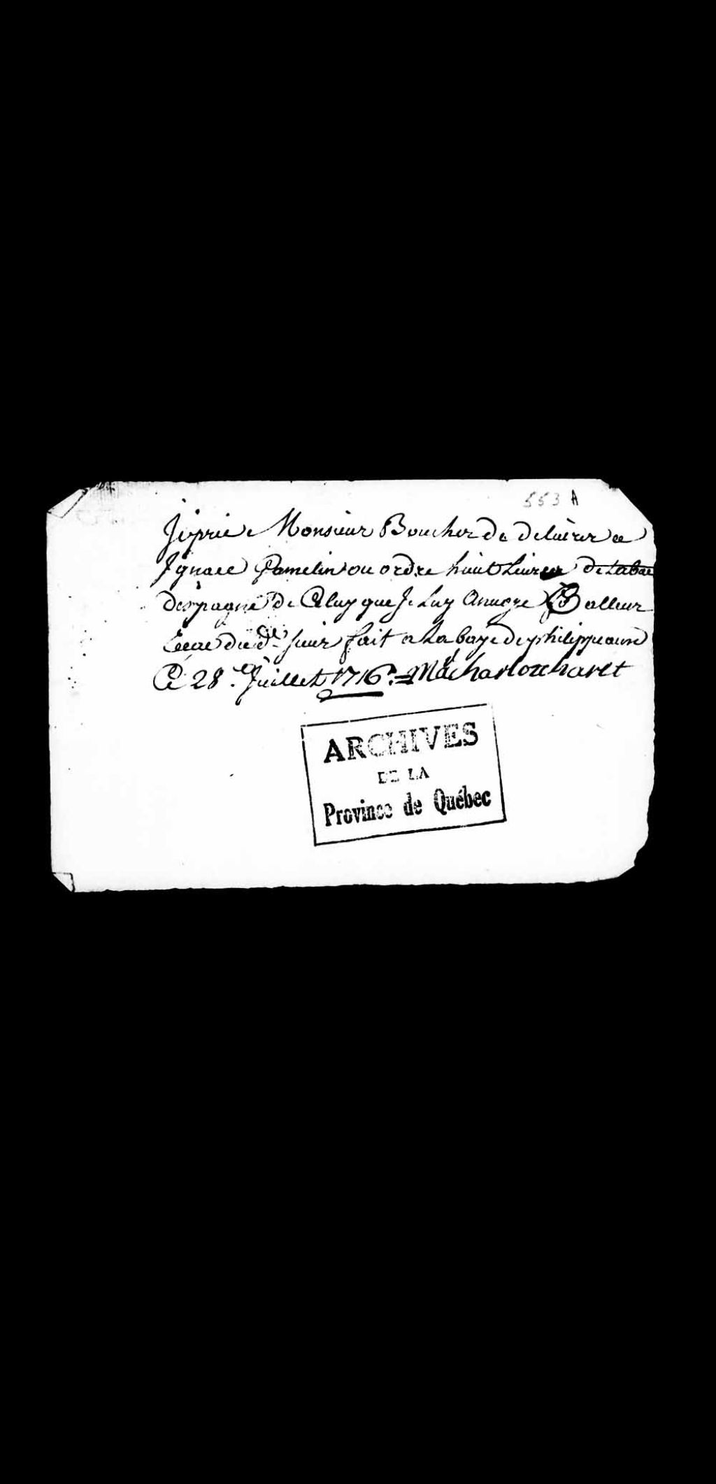 - Ce dossier comprend un billet fait par Charlotte Charet au sieur Boucher, au profit d'Ignace Gamelin; des billets faits par le sieur Courtemanche au sieur Boucher, au profit notamment de Laurent Levasseur, de la dame Argencourt, du sieur Charet, de George Plante, du sieur Delage, du sieur Laverdière, de Marie Charet et de Nicolas Lafrance; une quittance de Charlotte Charet au sieur Jean Duprat