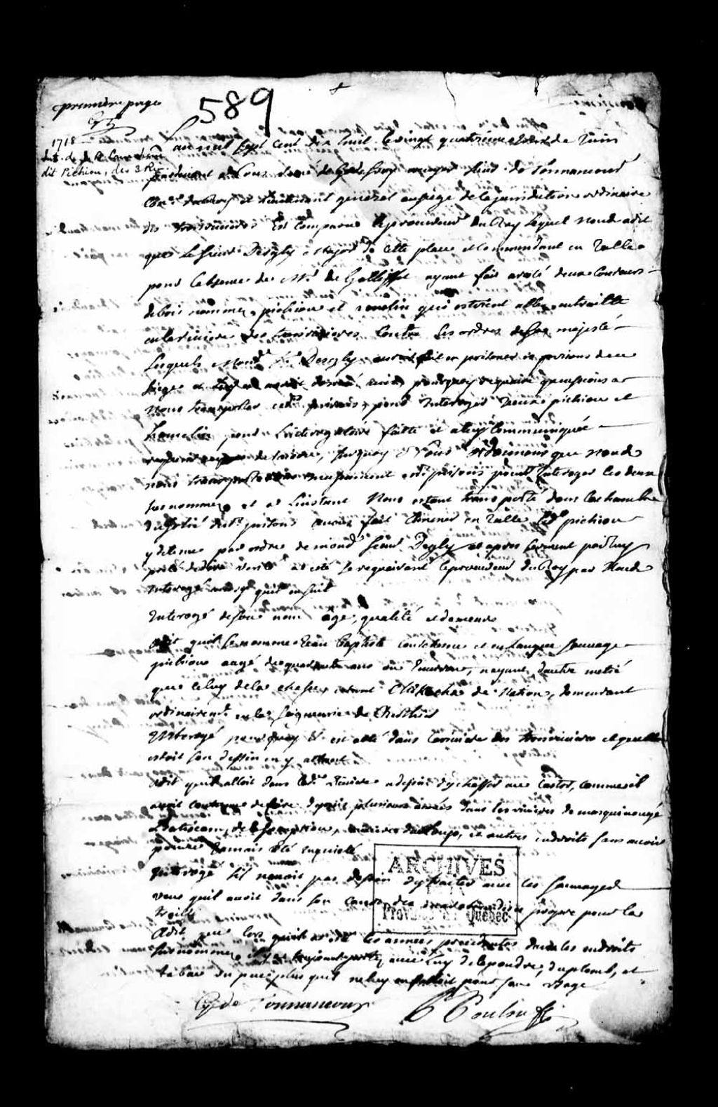Interrogatoire de Jean-Baptiste Courchesne, en langue sauvage (amérindienne) nommé Pichiou, âgé de 40 ans, Chicacha de nation, n'ayant d'autre métier que celui de la chasse, demeurant ordinairement en la seigneurie de Berthier, accusé d'avoir fait de la traite (castor) sur la rivière des Trois-Rivières, 24 juin 1718, Archives nationales à Québec, Collection Pièces judiciaires et notariales, (03Q,TL5,D589).