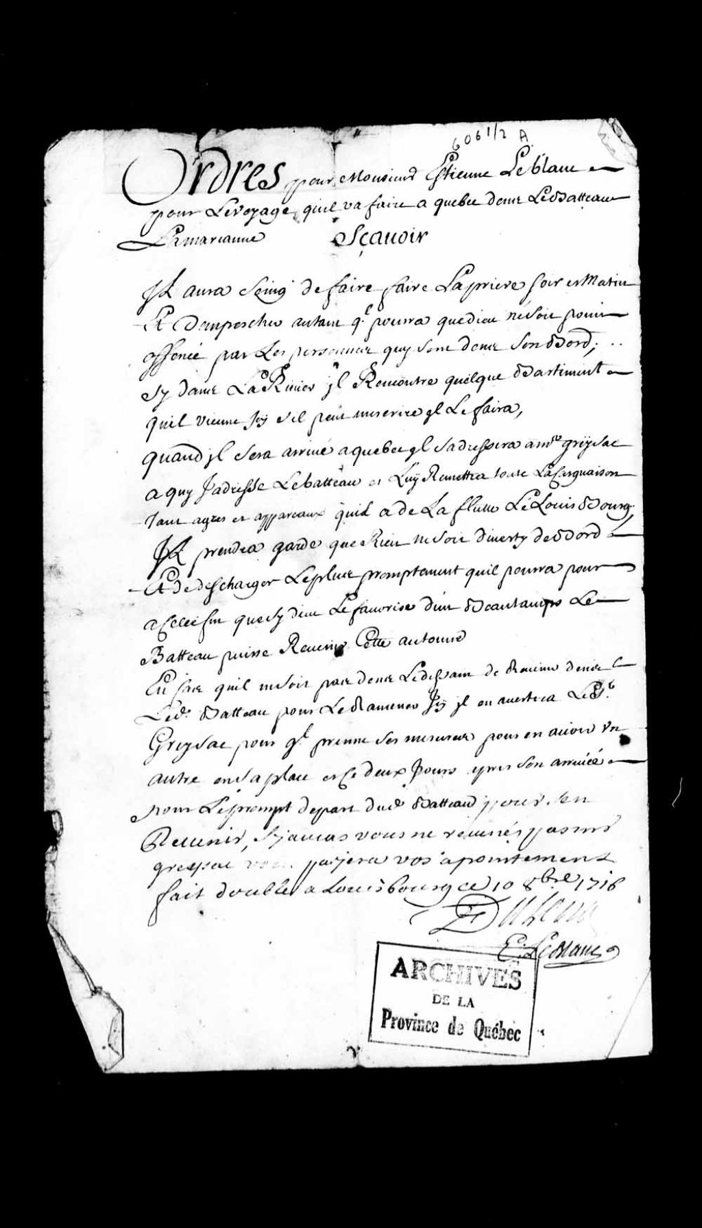 - Procès-verbal de l'authentification de l'ordre écrit donné au capitaine du bateau «La Marianne» (la Marie-Anne), Étienne Leblanc, dans le cadre du procès entre Etienne Dulong, marchand à Louisbourg ('île Royale), contre Gabriel Greysac, marchand à Québec