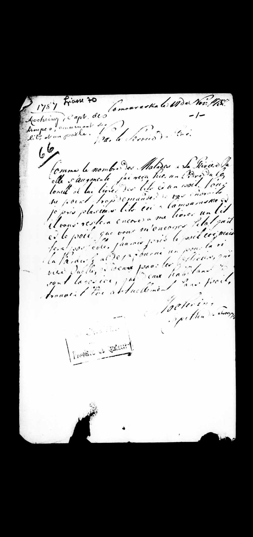 Document du nommé Mochring, capitaine dans les troupes et de la milice de la rivière des Caps, attestant sa réception d'un ordre du colonel, à propos de l'augmentation des malades; ledit colonel demande l'envoi de lits et d'un poêle, fait à Kamouraska, 14 novembre 1787, Archives nationales à Québec, Collection Pièces judiciaires et notariales, (03Q,TL5,D70066).
