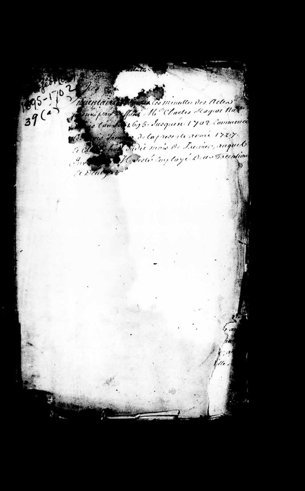 Inventaire et procès-verbal de l'inventaire des minutes de Charles Rageot, notaire en la Prévôté de Québec, entre le 26 août 1695 et le 9 décembre 1702, faits par Pierre André de Leigne, lieutenant général civil et criminel de la Prévôté de Québec et par Louis-Guillaume Verrier, procureur général du Roi, au Conseil supérieur de Québec et commissaire nommé par arrêt du Conseil d'État du Roi, le 25 mars 1730, pour le dépouillement des minutes des notaires présentement en charge ou décédés, dans l'étendue de la Prévôté de Québec, 3 janvier 1727 - 7 mars 1732, Archives nationales à Québec, Collection Pièces judiciaires et notariales, (03Q,TL5,D71039).