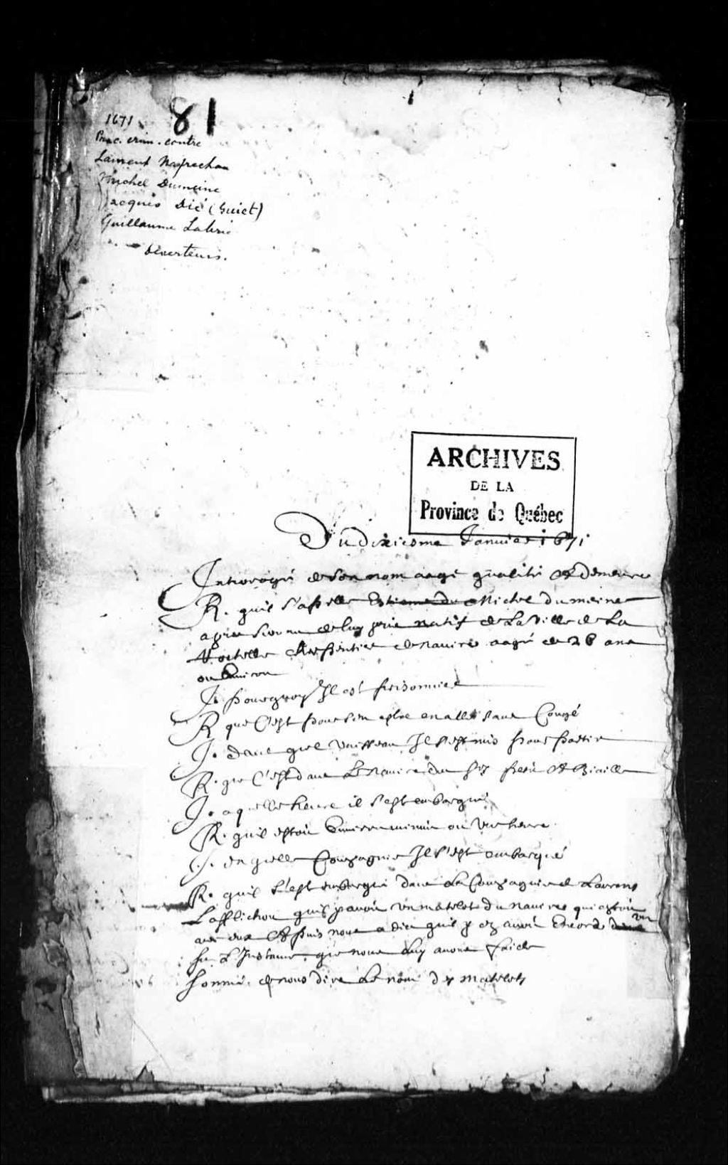 - Ce dossier en matières criminelles provient de la Prévôté de Québec et contient les interrogatoires ou les dépositions des personnes suivantes : Michel Dumaine, natif de La Rochelle, 26 ans, charpentier de navire; Jacques Dié (signe Guiet), natif de Saint-Gillin proche d Olonne, en Poitou, 27 ans, ancien contremaître de vaisseau, à présent au service de l intendant; Guillaume Labrie, natif du fort Louis, 15 ans, demeurant chez Pierre Niel; Laurent Nafrechou, natif de la paroisse de Lotigny, proche Boutonne, en Poitou, 26 ans, charpentier de navire. Ce dossier comprend l'information, les interrogatoires et la confrontation