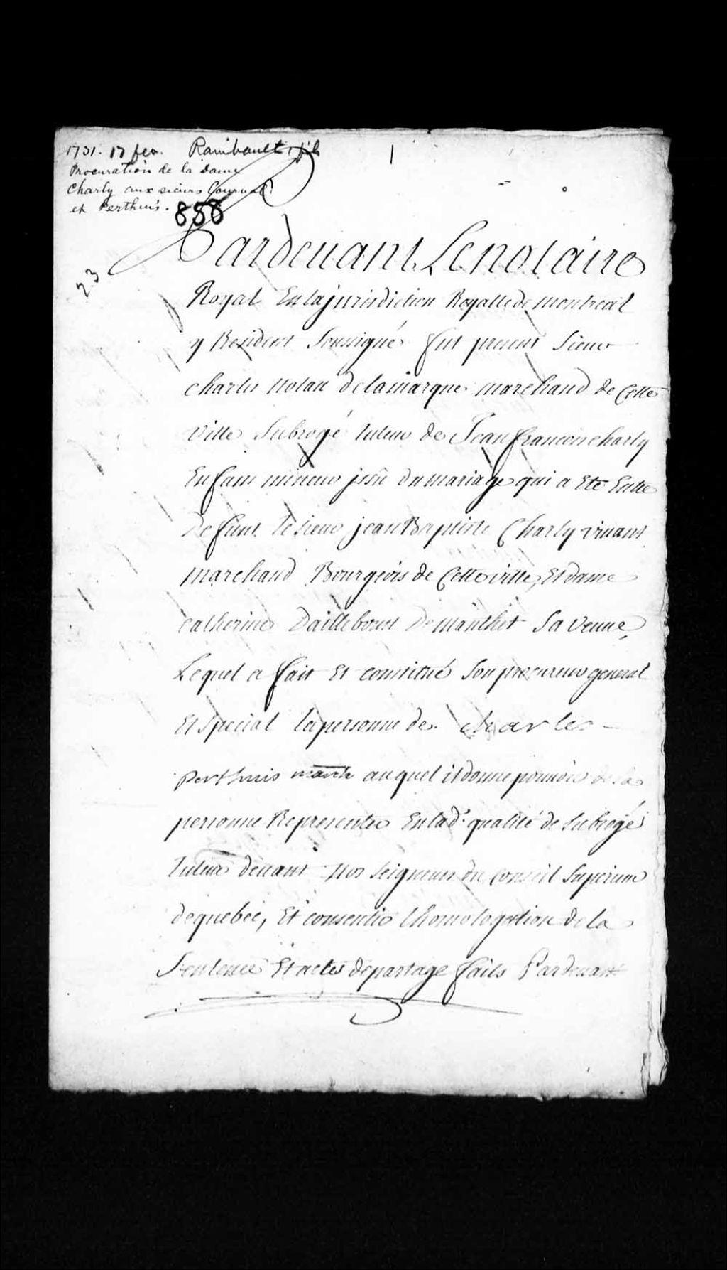 Procuration de Catherine d'Ailleboust de Mantet, veuve de Jean-Baptiste Charly, vivant marchand bourgeois de Montréal, et colonel de la milice du gouvernement de Montréal, à Charles Perthuis; suivie du consentement et homologation d'une sentence et acte de partage fait pardevant le lieutenant général de la Juridiction royale de Montréal, 8 janvier 1731, Archives nationales à Québec, Collection Pièces judiciaires et notariales, (03Q,TL5,D858).