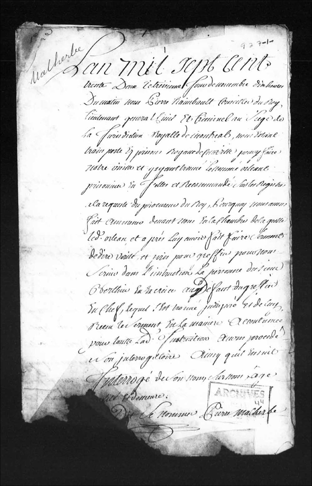- Ce dosssier en matières criminelles provient de la Juridiction royale de Montréal et du Conseil supérieur de Québec. Il comprend l'interrogatoire de Pierre Malherbe dit Orléans; les requêtes du procureur du Roi; les procès-verbaux de l'écrou de Pierre Malherbe; des exploits de signification et d'assignation; l'information des témoins; des ordonnances du lieutenant général au siège de la Juridiction royale de Montréal; une sentence rendue en la Juridiction royale de Montréal contre Pierre Malherbe; un second interrogatoire de l'accusé; les conclusions du procureur du Roi; la confrontation des témoins avec l'accusé; le récolement des témoins dans leurs dépositions; l'interrogatoire de l'accusé au Conseil supérieur de Québec; la sentence rendue au Conseil supérieur contre le sieur Malherbe. Ce dossier contient les interrogatoires ou les dépositions des personnes suivantes : Louis de Lacorne, écuyer et sieur de Chapt(es), officier des troupes du détachement de la Marine, en garnison à Montréal, demeurant rue Saint-Paul, âgé de 30 ans; Jean de Latouche dit Saint-Jean, sergent de la Compagnie de Longueuil, âgé de 38 ans, demeurant en sa maison rue Notre-Dame; Jacques Gadois Mauger, âgé de 45 ans, marchand bourgeois de Montréal, demeurant rue Saint-Paul
