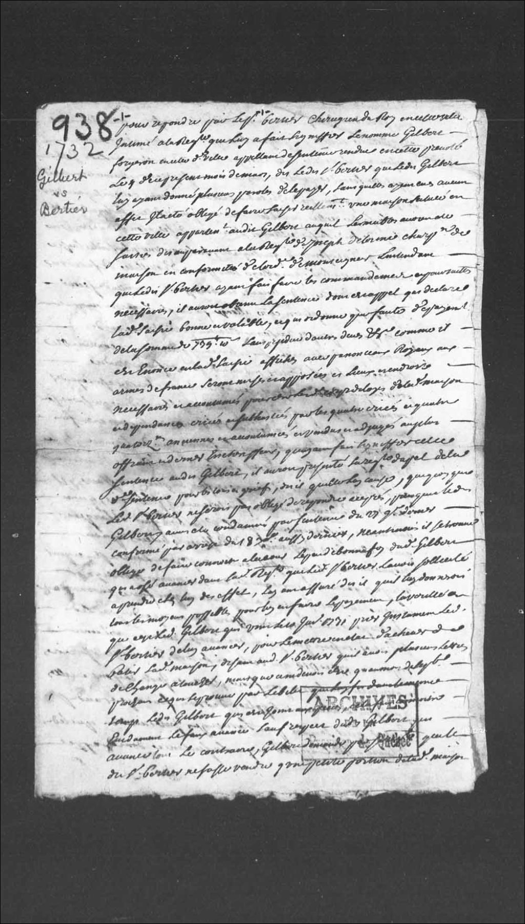 Réponses fournies par Michel Berthier, chirurgien du Roi à Québec, suivant la signification qui lui fut faite de la requête du nommé Augustin Gilbert, forgeron de Québec; ledit Gilbert appelant d'une sentence rendue en la Prévôté de Québec, en date du 27 novembre 1731, au sujet d'un billet de 739 livres dû par Gilbert à Berthier
