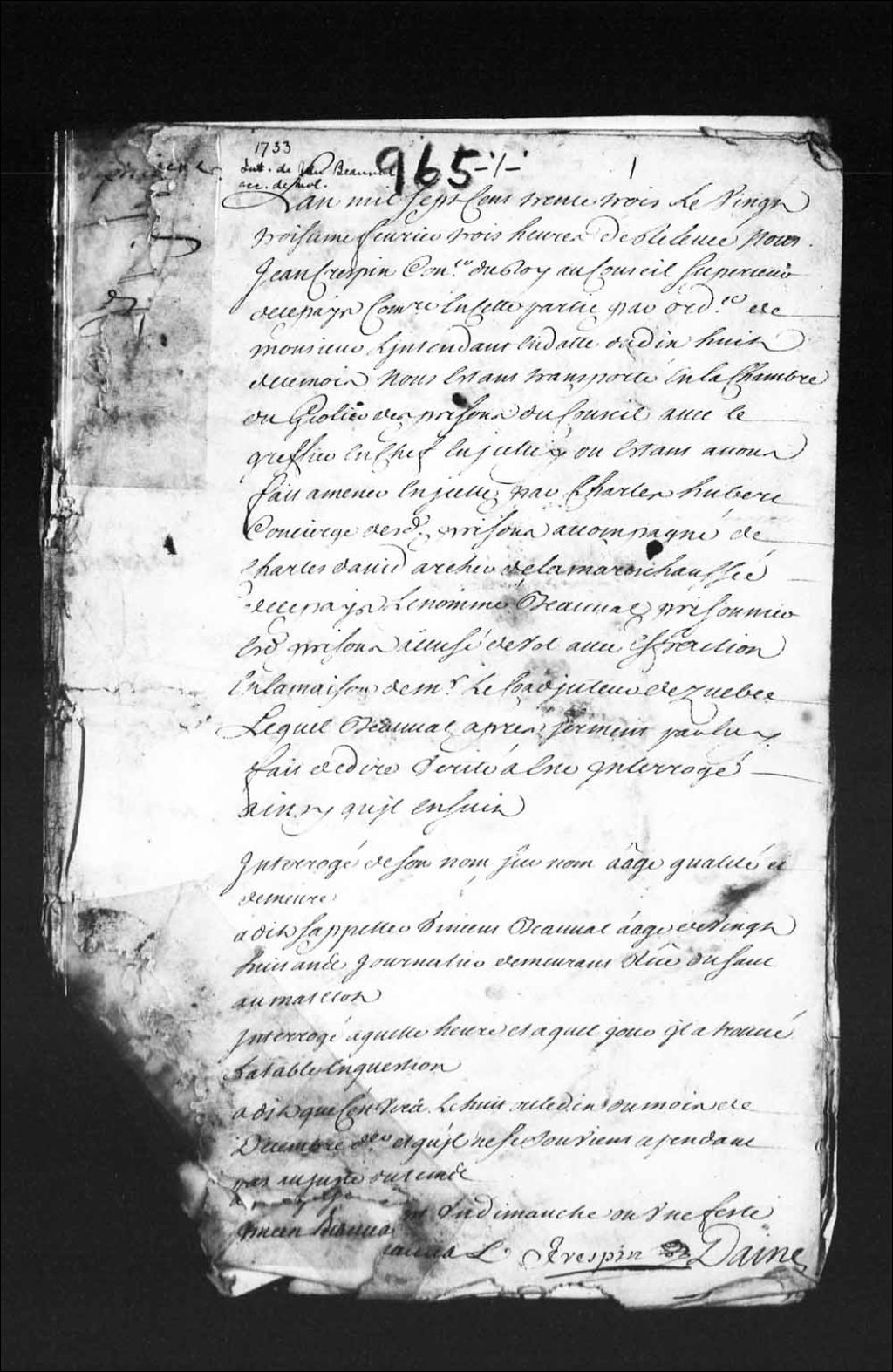 - Interrogatoire de Vincent Beauval, âgé de 28 ans, journalier, demeurant rue Sault-au-Matelot, à Québec, accusé de vol avec effraction; ledit interrogatoire fait par Jean Crespin (Crépin), conseiller du Roi au Conseil supérieur de Québec, suivant l'ordonnance de l'intendant