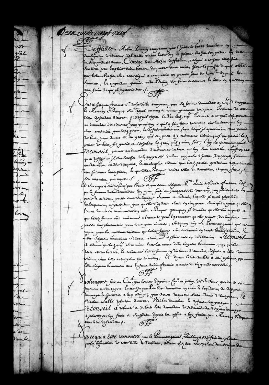 Arrêt qui déboute Jacques Doublet de sa demande en dommages et intérêts, sur le rapport du sieur de Peiras, de l'instance pendante entre Doublet et le sieur Nicolas Labbé, 6 mai 1675, Archives nationales à Québec, Fonds Conseil souverain, (03Q,TP1,S28,P1096).