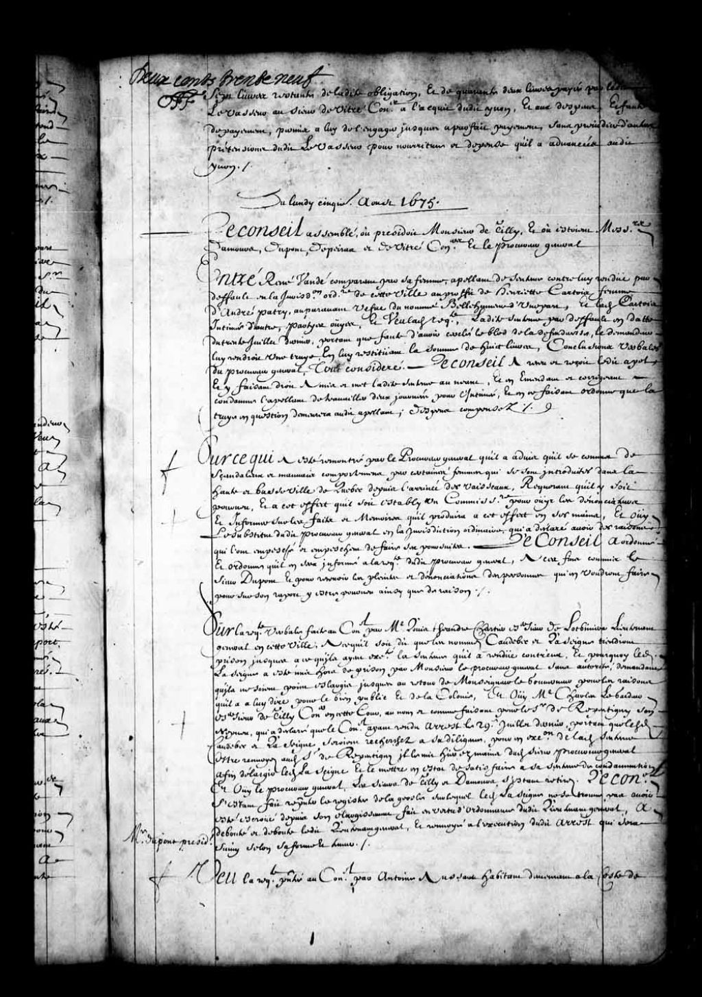 Nomination du sieur Dupont comme commissaire pour recevoir les plaintes contre les comportements scandaleux (prostitution) de certaines femmes qui se sont introduites dans la Haute et Basse-Ville de Québec depuis l'arrivée des vaisseaux, 5 août 1675, Archives nationales à Québec, Fonds Conseil souverain, (03Q,TP1,S28,P1146).