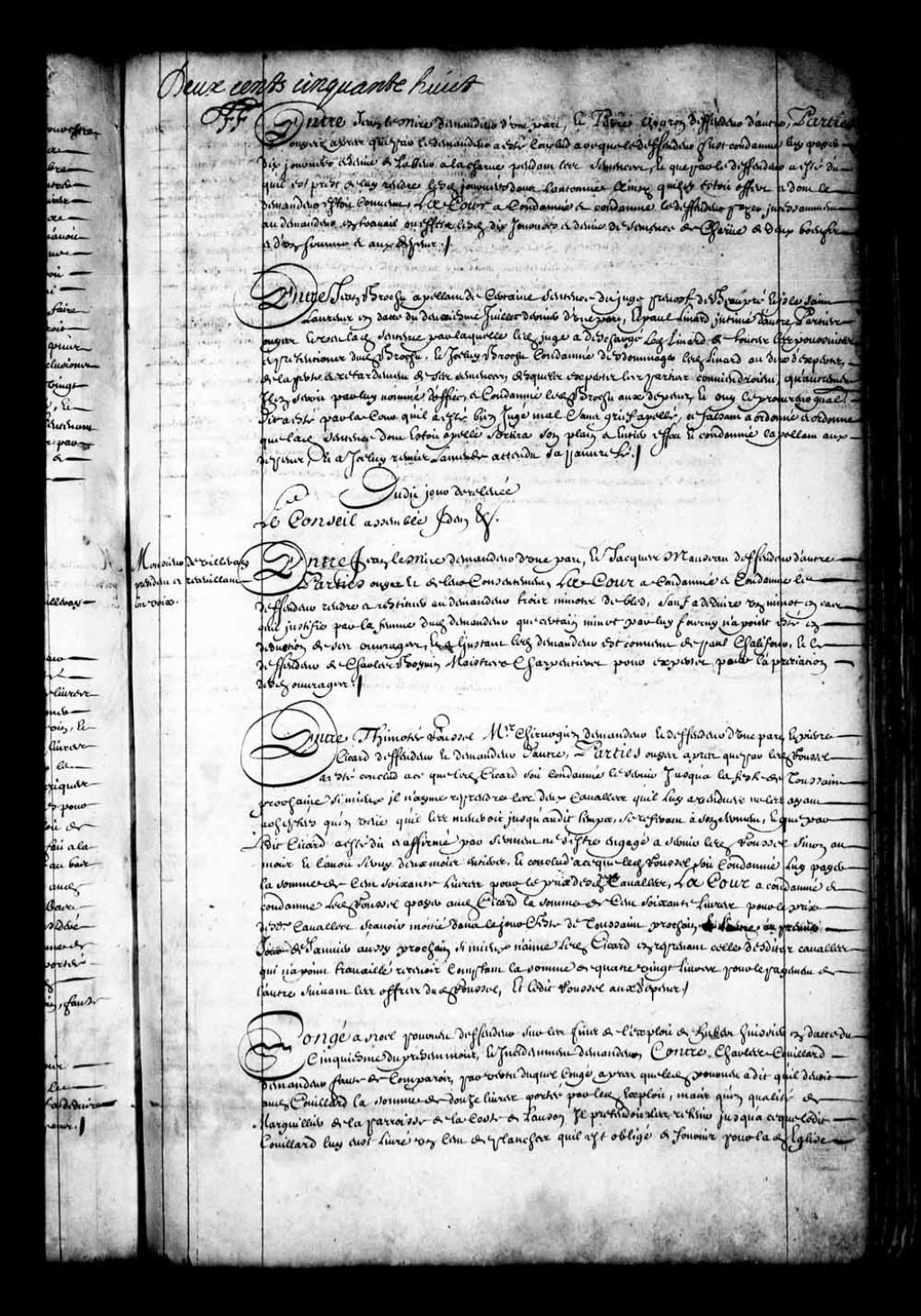 Transcription du texte avec orthographe modernisée : «Dudit jour de relevée. Le Conseil assemblé Idem Etc. Monsieur de Villeray présidant et recueillant les voix. Entre Jean Lemire demandeur d'une part, et Jacques MANSEAU défendeur d'autre. Parties ouïes et de leur consentement la Cour a condamné et condamne le défendeur rendre et restituer au demandeur trois minots de blé, sauf à déduire un minot en cas qu'il justifie par la femme du demandeur que certain minot par lui fourni n'a point été en déduction de ses ouvrages, et à l'instant ledit demandeur est convenu de Paul Chalifour, et le défendeur de Charles Boyvin, maîtres charpentiers pour experts pour l'appréciation desdits ouvrages.»