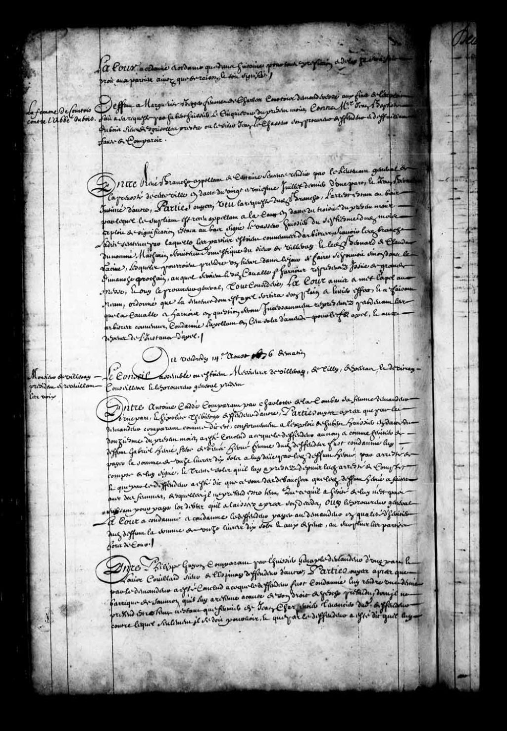 Transcription du texte avec orthographe modernisée : «Entre Philippe GUYON comparant, par l'huissier Genaple demandeur d'une part; et Louis COUILLARD sieur de L'ESPINAY défendeur d'autre. Parties ouïes après que par le demandeur a été conclu à ce que le défendeur fut condamné lui rendre une demie barrique de Saumon qu'il lui a retenue à cause de son droit de pêche prétendu, dont il ne prétend être tenu n'étant que fermier de Jean Charpentier tenancier dudit défendeur, contre lequel seulement il se doit pourvoir ; et que par le défendeur a été dit qu'il lui est dû la onzième partie du poisson qui se pêche sur les terres par lui concédées à ses tenanciers, ce qui l'a obligé de retenir la demie barrique du poisson qui se pêche sur les terres par lui concédées à ses tenanciers, ce qui l'a obligé de retenir la demie barrique de Saumon en question, sur laquelle il demande à être fourni de son droit, la Cour a ordonné et ordonne que sur ladite [...]