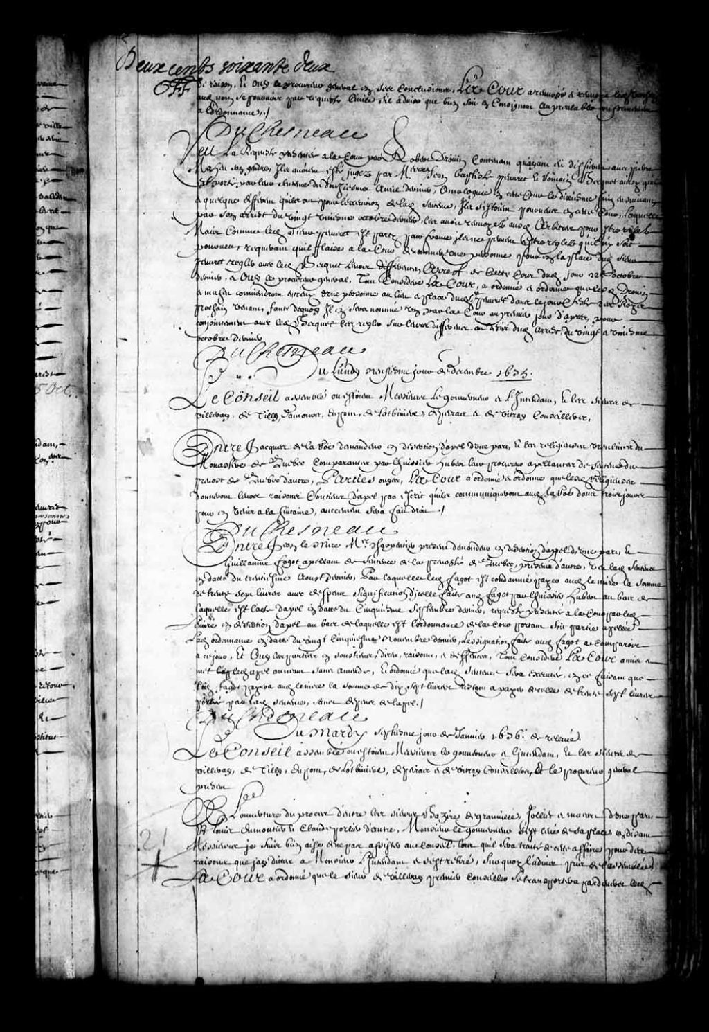 Transcription du texte avec orthographe modernisée : «Entre Jean Lemire maître charpentier présent demandeur en désertion d'appel d'une part; et Guillaume FAGOT appelant de sentence de la prévôté de Québec présent d'autre; vu ladite sentence en date du trentième août dernier, par laquelle ledit Fagot est condamné payer audit Lemire la somme de trente-sept livres avec dépens; signification d'icelle faite audit Fagot par l'huissier Hubert, au bas de laquelle est l'acte d'appel en date du cinquième septembre dernier; requête présentée à la Cour par ledit Lemire en désertion d'appel, au bas de laquelle est l'ordonnance de la Cour portant soit partie appelée, ladite ordonnance en date du vingt-cinquième novembre dernier; l'assignation faite audit Fagot à comparaître à ce jour, et ouï les parties en soutiens, dires, raisons, et défenses, tout considéré. La Cour a mis et met ledit appel au néant sans amende; et ordonné que ladite sentence sera exécutée, en ce faisant que ledit Fagot payera audit Lemire la somme de dix-sept livres restant à payer de celle de trente-sept livres portée par ladite sentence, sans dépens de l'appel. DUCHESNEAU.»