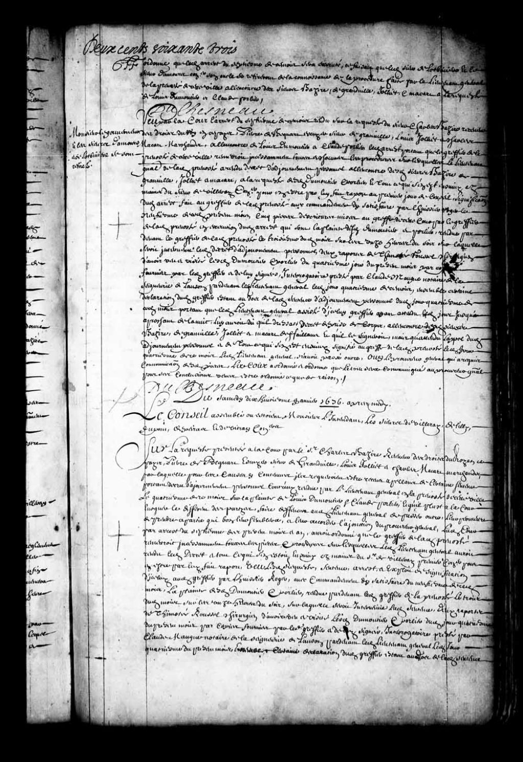 - Transcription du texte avec orthographe modernisée : «Du samedi dix-huitième janvier 1676 après midi. Le Conseil assemblé où étaient Monsieur l'intendant les sieurs de Villeray, de Tilly, Dupont, Depeiras et de Vitray conseillers. Sur la requête présentée à la Cour par le sieur Charles Bazire, receveur des droits du Roi en ce pays, Pierre de Becquart écuyer sieur de Grandville (Granville), Louis Jolliet et Charles Macart (Macard) marchands, par laquelle pour les causes y contenues ils requéraient être reçues appelant de certaine sentence portant décret d'ajournement personnel contre eux rendue par le lieutenant général en la prévôté de cette ville le quatrième de ce mois sur la plainte de Louis Dumontier et Claude Porlier, et qu'il plût à la Cour évoquer le différent des parties, faire défenses audit lieutenant général de passer outre, leur permettre de prendre à partie qui bon leur semblera, et leur accorder la jonction du procureur général; ladite Cour par arrêt du septième des présent mois et an, aurait ordonné que le greffier de ladite prévôté remettrait incessamment toutes les pièces et procédures sur les qu'elles ledit lieutenant général aurait rendu ledit décret et tout ce qui s'en était ensuivi, en les mains du sieur de Villeray premier conseiller, pour en être par lui fait rapport; vu lesdites requête, sentence, arrêt, et exploit de signification d'icelui audit greffier par l'huissier Roger, avec commandement d'y satisfaire du neuvième de ce dit mois; la plainte desdits Dumontier et Porlier rendue par-devant ledit greffier de la prévôté le trois dudit mois sur les onze heures du soir, sur laquelle serait intervenue ladite sentence; deux rapports de Timothée Roussel chirurgien d'avoir vu et visité lesdits Dumontier et Porlier dudit jour quatrième du présent mois par copies fournies par ledit greffier et de lui signées, interrogatoire prêté par Claude Maugue notaire de la seigneurie de Lauson par-devant ledit lieutenant général ledit jour quatrième du présent mois, ensemble certaine déclaration dudit greffier étant au dos de ladite sentence d'ajournement personnel dudit jour quatrième de ce dit mois, portant que ledit lieutenant général assisté dudit greffier ayant attendu ledit jour jusque approchant de la nuit, lui aurait dit qu'il dressât décret de prise de corps à l'encontre desdits Bazire, de Grandville, Jolliet et Macart, défaillants, et qu'il signerait, mais qu'attendu l'appel dudit ajournement personnel et de tout ce qui s'en est ensuivi signifié au greffe de ladite prévôté ledit jour quatrième de ce mois, ledit lieutenant n'aurait passé outre, autre requête présentée à la Cour par lesdits Bazire, de Grandville, Jolliet et Macart par laquelle en autres choses pour les raisons y contenues ils requièrent permission de prendre à partie ledit lieutenant général, et icelui faire intimer pour répondre au contenu de ladite requête et autres faits qui seraient mis en les mains du procureur général dont ils demandaient la jonction tant à l'encontre dudit lieutenant général que desdits Dumontier et Porlier, qu'il fût défendu audit lieutenant général de passer outre à l'information requise par Isaac Cailhou à l'encontre desdits Bazire, de Grandville, Jolliet et Macart, et de connaître à l'avenir d'aucunes affaires ou ils seraient intéressés, sauf à eux de prendre ci-après telles conclusions qu'ils aviseront bon être contre qui il appartiendra par raison, l'ordonnance étant au bas portant qu'icelle requête et pièces y jointes seraient mises en les mains dudit sieur de Villeray pour en faire son rapport; ladite requête et ordonnance en date dudit jour neuvième dudit mois; l'arrêt du quatorzième dudit mois ensuivant portant que le tout serait communiqué au procureur général; conclusions du procureur général en conséquence, en date du jourd'hier, et tout considéré la Cour avant faire droit sur l'évocation prétendue et sur aucuns chefs de la requête desdits Bazire, de Grandville Jolliet et Macart, dudit jour neuvième du présent mois, les a reçus et reçoit appelants de ladite sentence d'ajournement personnel, et tout ce qui s'en est ensuivi, à eux permis de faire intimer lesdits lieutenant général, Dumontier et Porlier, auxquels ils communiqueront dans trois jours leurs griefs et moyens d'appel, et audit lieutenant général leur prise à partie, lesquels fourniront et produiront leurs réponses au greffe de la Cour trois jours après pour le tout communiqué au procureur général et au rapport dudit sieur de Villeray leur être fait droit au premier jour de Conseil, auquel jour les parties viendront près, mande ladite Cour Etc. DUCHESNEAU.»