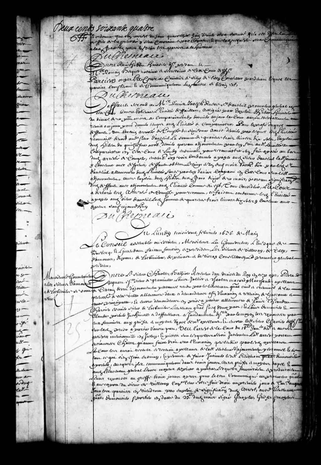 - Transcription du texte avec orthographe modernisée : «Du lundi troisième février 1676 de matin. Le Conseil assemblé où étaient Messieurs le gouverneur, l'évêque de Québec, et l'intendant faisant fonction de président, les sieurs de Villeray, de Tilly, Damours, Dupont, de Lotbinière, Depeiras, et de Vitray conseillers, le procureur général présent. Monsieur le gouverneur et les sieurs Damours et de Lotbinière se sont retirés. Entre le sieur Charles BAZIRE receveur des droits du Roi en ce pays, Pierre de BEQUART écuyer sieur de GRANDVILLE, Louis JOLLIET et Charles MACARD marchands appelant de certain décret d'ajournement personnel rendu par le lieutenant général civil et criminel de la prévôté de cette ville à l'encontre d'eux et demandeurs afin d'évocation et rétention de l'instance et cause principale et encore demandeurs en prise à partie à l'encontre de Louis Théandre CHARTIER écuyer sieur de LOTBINIERE lieutenant général susdit d'une part, et Louis DUMONTIER et Claude PORLIER intimés et défendeurs et incidemment demandeurs par le moyen des réponses par eux fournies aux griefs et moyens d'appel desdits appelants, et encore ledit sieur CHARTIER défendeur sur ladite prise à partie d'autre part; vu l'arrêt de la Cour du 18e janvier dernier et autres arrêts mentionnés en icelui, et pièces, sur lesquelles serait intervenu ledit arrêt portant entre autres choses qu'avant faire droit sur l'évocation prétendue par lesdits appelants la Cour les aurait reçus et recevait appelant de ladite sentence d'ajournement personnel et de tout ce qui s'en était ensuivi, et permis de faire intimer lesdits lieutenant général, Dumontier et Porlier, auxquels ils communiqueraient dans trois jours leurs griefs et moyens d'appel et audit lieutenant général leurs moyens de prise à partie, lesquels fourniraient et produiraient leurs réponses au greffe trois jours après, pour le tout communiqué au procureur général et au rapport du sieur de Villeray conseiller leur être fait droit au premier jour de Conseil, auquel jour les parties en viendront par exploit de signification dudit arrêt auxdits lieutenant général, Dumontier et Porlier en date du vingt-troisième dudit mois signé Genaple; griefs et moyens d'appel et de prise à partie desdits appelants contre lesdits lieutenant général, Dumontier et Porlier; réponses auxdits griefs et moyens d'appel fournis par lesdits Dumontier et Porlier, contenant leurs conclusions et demandes; conclusions du procureur général de ce jour auquel le tout a été communiqué; requête dudit lieutenant général présentée ce jourd'hui à la Cour, et ledit procureur général ouï sur icelui, et tout considéré dit a été par la Cour qu'il a été mal procédé et ordonné par ledit lieutenant général, que ladite sentence et décret d'ajournement personnel dudit jour quatrième janvier, et tout ce qui s'en est ensuivi sera cassé et annulé sauf à avoir tel égard que de raison aux rapports en chirurgie mentionnés auxdits arrêts, et débouté lesdits Dumontier et Porlier de leurs demandes. Nota que l'édit de 1679 intervenu depuis, défend d'évoquer sinon dans les cas de l'ordonnance de 1667. Ce faisant ladite Cour a évoqué et retenu, évoque et retient l'instance et cause principale et à iceux permis de s'y pourvoir par requête contenant leur plainte, pour sur icelle être ordonné ce que de raison, dépens, dommages et intérêts réservés en définitive, et au regard dudit lieutenant général, ladite Cour de grâce a prorogé et proroge un délai de trois jours pour fournir et produire ses réponses aux moyens d'appel à lui signifiés à la requête desdits appelants pour en venir prêts au premier jour, et cependant ayant aucunement égard à ladite requête dudit lieutenant général, ordonné qu'elle sera signifiée auxdits appelants, lesquels notamment ledit sieur Bazire fournira les moyens de prise à partie et de récusation par eux réservés dans pareil délai de trois jours, et ledit lieutenant général ses défenses trois jours après pour en venir prêts au premier jour. DUCHESNEAU.»