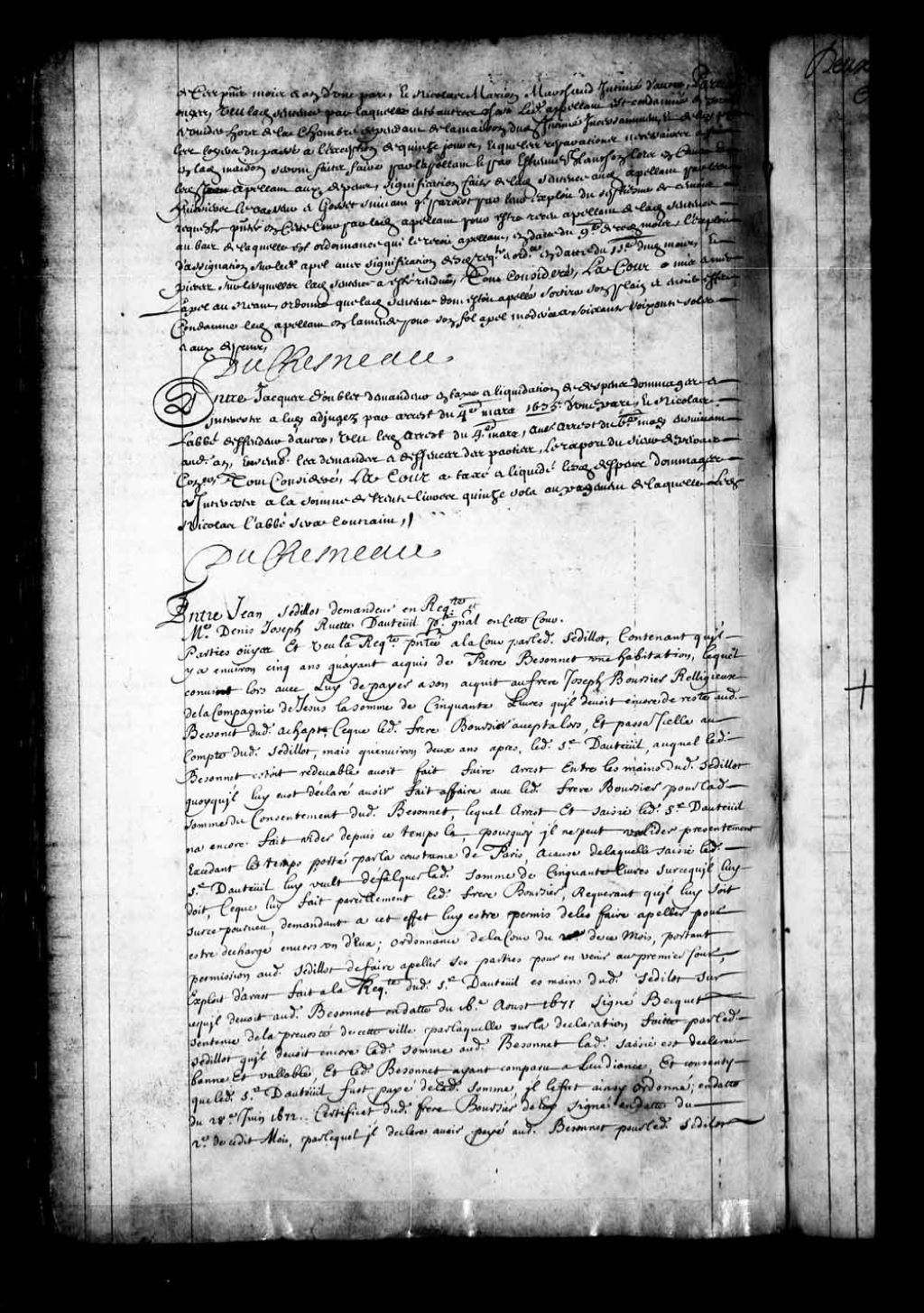 Transcription du texte avec orthographe modernisée : «Entre Jacques DOUBLET demandeur en taxe et liquidation de dépens, dommages et intérêts à lui adjugés par arrêt du quatrième mars 1675 d'une part, et Nicolas LABBÉ défendeur d'autre; vu ledit arrêt du quatrième mars; autre arrêt du sixième mai ensuivant audit an, ensemble les demandes et défenses des parties; le rapport du sieur Depeiras conseiller tout considéré, la Cour a taxé et liquidé lesdits dépens, dommages et intérêts à la somme de trente livres quinze sols, au payement de laquelle ledit Nicolas Labbé sera contraint. DUCHESNEAU.»