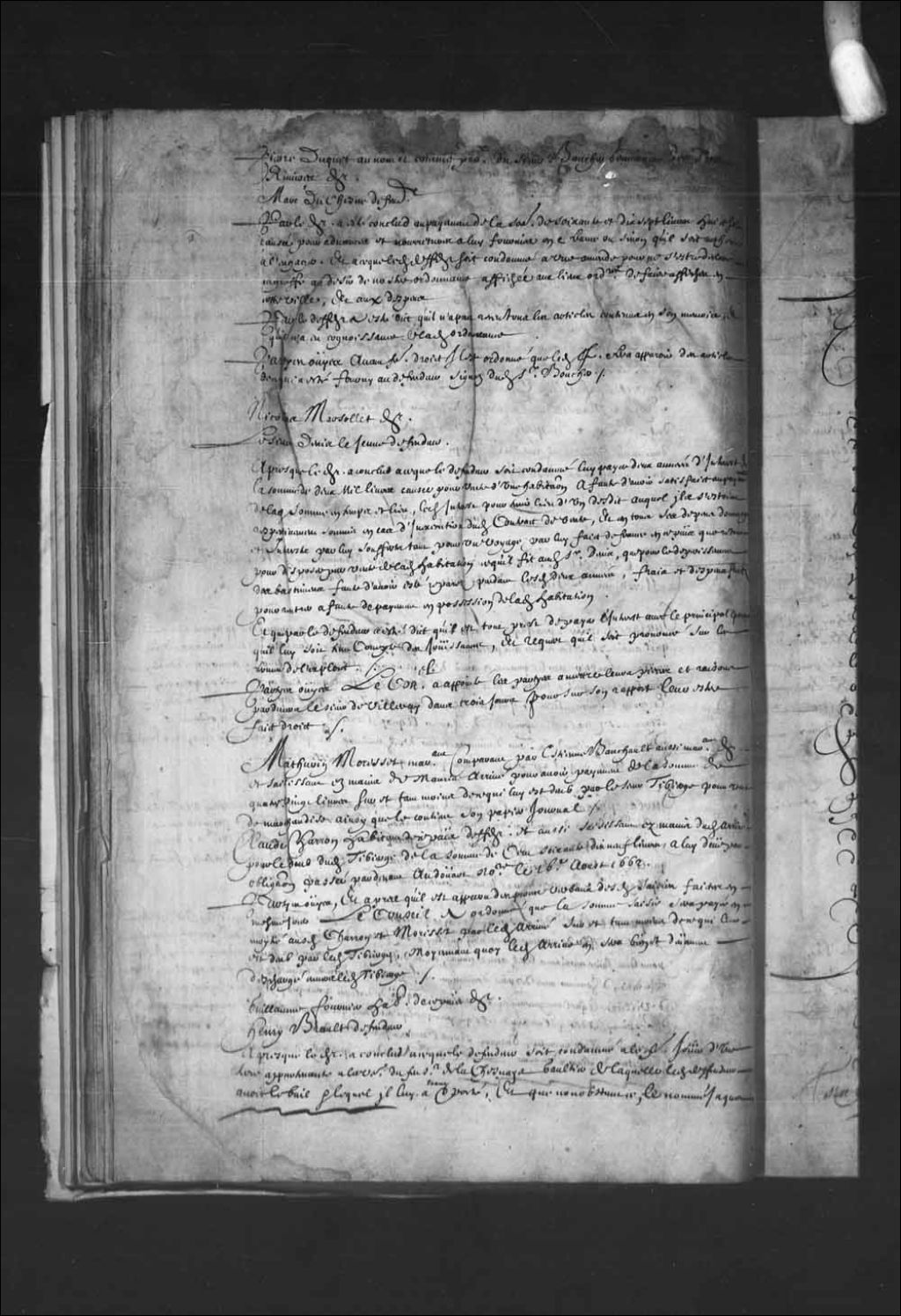 Transcription du texte avec orthographe modernisée : «Pierre DUQUET au nom et comme procureur du sieur Boucher gouverneur des Trois-Rivières demandeur. Marc DUCHESNE défendeur. Par le demandeur a été conclu au payement de la somme de soixante-dix-sept livres huit sols causée par avances et nourriture à lui fournies en France ou sinon qu'il soit autorisé à l'engager et à ce que le défendeur soit condamné à une amende pour ne s'être déclaré au greffe au désir de notre ordonnance affichée aux lieux ordinaires de faire affiches en cette ville, et aux dépens par le défendeur a été dit qu'il n'a pas reçu tous les articles contenus en son mémoire, et qu'il n'a eu connaissance de ladite ordonnance. Parties ouïes avant faire droit il est ordonné que ledit demandeur fera apparaître des articles de ce qui a été fourni au défendeur signés dudit sieur Boucher.»