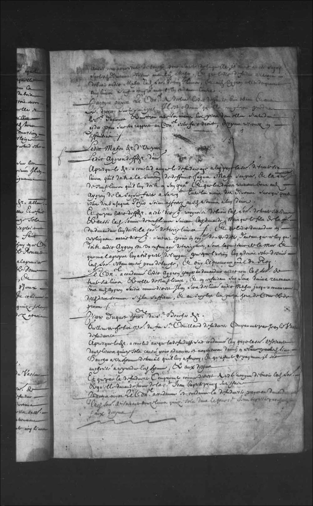 - Transcription du texte avec orthographe modernisée : «Ledit MAHEU demandeur d'une part ledit AYGRON défendeur d'autre après que le demandeur a conclu à ce que le défendeur aie à lui payer la somme de trente-six livres qu'il doit à la succession de défunt Jacques Maheu son père, et la somme de neuf livres qu'il lui doit en son particulier et que les deniers revenant bons audit Aygron de la saisie faite à sa requête entre les mains des directeurs sur ce qui peut-être dû à Jacques Lozier soient affectés aux dites sommes à lui dues. Et que par ledit défendeur a été dit qu'il reconnaît devoir ladite somme de trente six livres et aussi ladite somme de neuf livres suivant ladite demande, mais que le fils de la femme du demandeur lui doit la somme de treize livres. Et que ledit demandeur en répliquant aurait dit qu'il n'entrait point en reconnaissance de cette dette, d'autant que icelui qui doit audit Aygron est un enfant âgé de treize ans, sous la puissance de la mère et que mal à propos lui a-t-il prêté de l'argent puisque l'action lui en devait être déniée ladite somme étant causée pour débauche, et ouï le procureur général du Roi. Le Conseil a condamné ledit Aygron payer au demandeur audit nom ladite somme de trente-six livres et celle de neuf livres, et en ce faisant sur iceux deniers revenant bons audit Aygron saisis comme dit est il en sera délivré audit Maheu jusqu'à concurrence desdites deux sommes s'ils suffisent, et au surplus les parties hors de Cour et de procès.»
