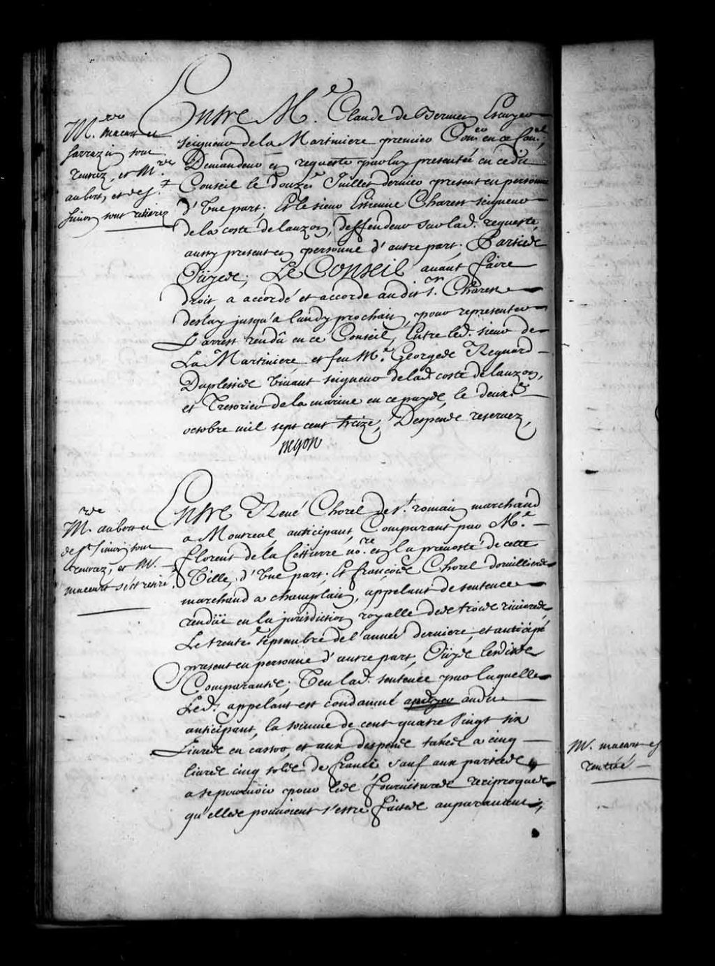 Arrêt qui accorde, avant de faire droit, un délai à Étienne Charest, seigneur de Lauzon, pour présenter l'arrêt rendu au Conseil Supérieur, le 2 octobre 1713, entre le sieur Bermen de la Martinière et feu Georges Regnard Duplessis, seigneur de Lauzon, 2 août 1717, Archives nationales à Québec, Fonds Conseil souverain, (03Q,TP1,S28,P15089).