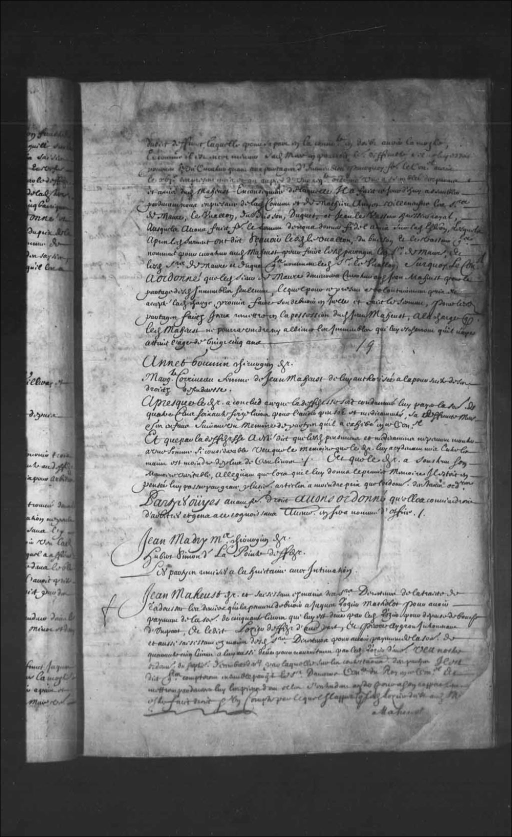 - Transcription du texte avec orthographe modernisée : «Jean MAHEUST demandeur et saisissant en les mains des sieurs directeurs de la traite de Tadoussac les deniers qu'ils peuvent devoir à Jacques Lozier matelot pour avoir payement de la somme de cinquante livres qui lui est due par ledit Lozier pour dépense de bouche d'une part, et ledit Lozier défendeur d'autre part, et Pierre AYGRON intervenant et aussi saisissant en les mains desdits sieurs directeurs pour avoir payement de la somme de quarante-cinq livres à lui aussi due pour nourriture par ledit Lozier d'autre. Vu notre ordonnance du septième décembre dernier par laquelle sur les contestations des parties il est dit qu'elles compteront ensemble par-devant le sieur Damours conseiller du Roi en ce Conseil et mettront par devers lui les pièces dont elles s'entendent aider pour à son rapport leur être fait droit et un compte par lequel il appert que ledit Lozier doit audit Maheust de reste la somme de quarante-sept libres deux sols ouï le rapport dudit sieur Damours tout considéré. Le Conseil faisant droit a ordonné et ordonne que lesdits directeurs videront leurs mains des deniers sur eux saisis pour le dû dudit Lozier en celles desdits Maheust et Aygron, quoi faisant ils en demeureront bien et valablement déchargés envers ledit Lozier, sauf auxdits Maheust et Aygron à se pourvoir à l'encontre dudit Lozier si lesdits deniers ne suffisent a les satisfaire de leur dû, et ce faisant il est ordonné que l'arrêt de ce Conseil dudit jour septième décembre dernier sera exécuté entre lesdits Maheust et Aygron et condamné ledit Lozier aux dépens.»