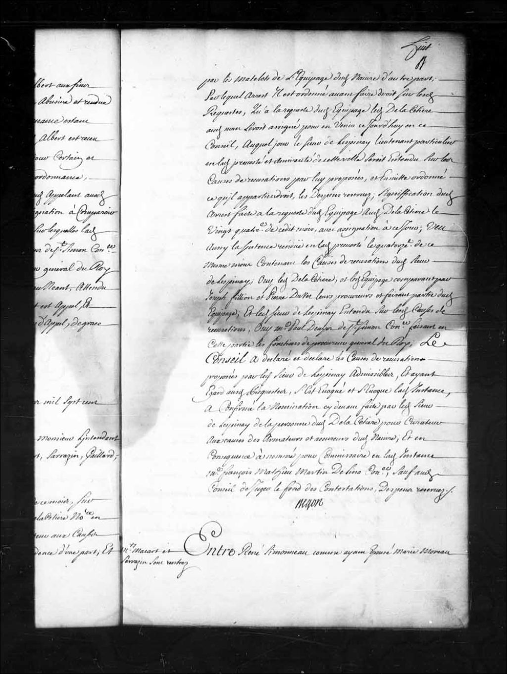 Arrêt qui déclare René Simoneau, époux de Marie Moreau, et René Minos (Minaud), époux de Marie-Anne Moreau, non recevables en leur requête du 1er août 1718, dans leur cause contre René Moreau, habitant de l'île et comté de Saint-Laurent, au sujet de la succession de feu Nicolas Moreau. Ordonne que l'arrêt du 24 janvier 1718 selon sa forme et teneur, 27 mars 1719, Archives nationales à Québec, Fonds Conseil souverain, (03Q,TP1,S28,P15267).