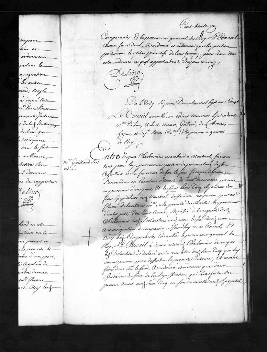 Acte donné à Jacques Charbonnier de ce que le sieur Florent de LaCetière a déclaré être en possession d'une lettre du sieur Turcq qui lui donne pouvoir pour défendre la présente instance; avant de faire droit sur le fond, il est ordonné que dans huitaine le Frère Turcq sera tenu de donner communication au sieur Charbonnier des titres de propriété des biens de la succession du sieur Charon, et faute de satisfaire dans le dit délai permis au sieur Charbonnier de faire saisir tous les biens qui composent le temporel de l'Hôpital des Frères Hospitaliers, 16 décembre 1720, Archives nationales à Québec, Fonds Conseil souverain, (03Q,TP1,S28,P15509).