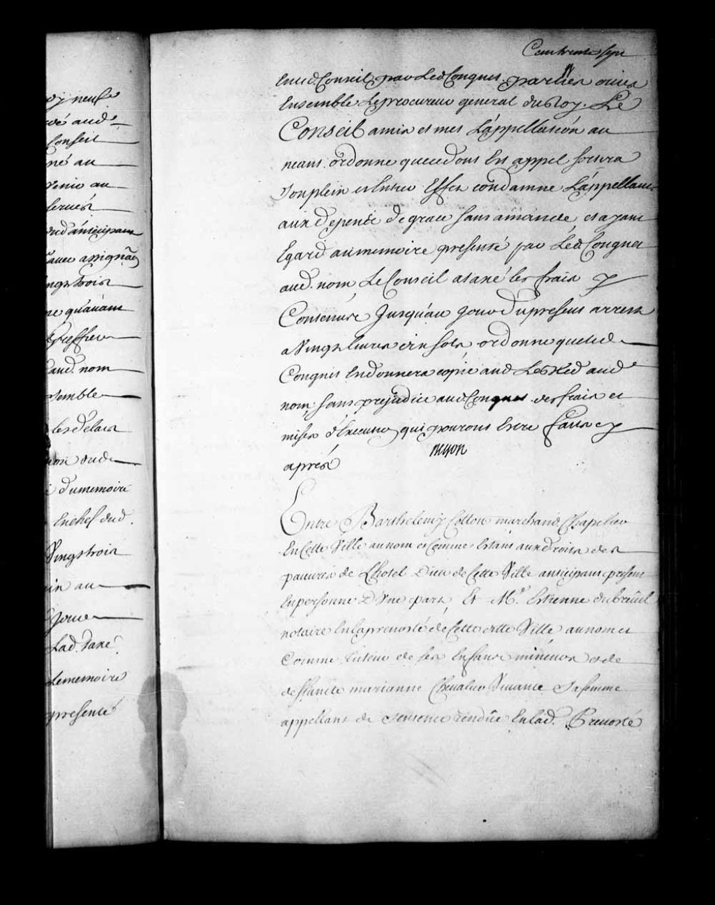 Arrêt qui ordonne qu' Etienne Dubreuil, notaire à Québec, tuteur des enfants mineurs de Barthélemy Coton et de Marianne Chevalier, convoquera une assemblée des parents et amis des dits mineurs devant Charles Macart, conseiller, pour délibérer s'il leur convient de payer les arrérages de cens et rentes de l'emplacement dont les Dames de l'Hôtel-Dieu de Québec avaient fait cession au dit Coton, 14 décembre 1722, Archives nationales à Québec, Fonds Conseil souverain, (03Q,TP1,S28,P15813).