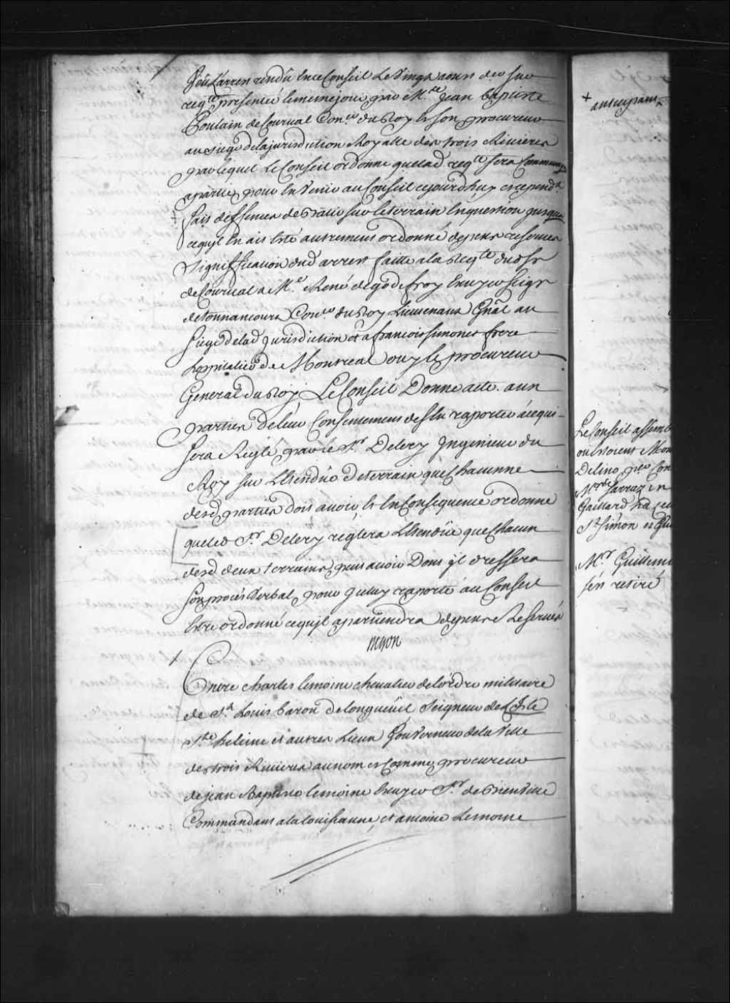 Arrêt qui ordonne aux parties de remettre leurs pièces à François-Mathieu Martin de Lino, conseiller, dans la cause de Charles Lemoyne, Chevalier de Saint-Louis, baron de Longueuil, seigneur de l'île Sainte-Hélène, gouverneur des Trois-Rivières, au nom et comme procureur de Jean-Baptiste Lemoyne de Bienville, commandant à la Louisiane, et Antoine Lemoyne de Châteauguay, capitaine du dit lieu, étant aux droits de Louis Dupré, contre Jacques Charbonnier, marchand à Montréal
