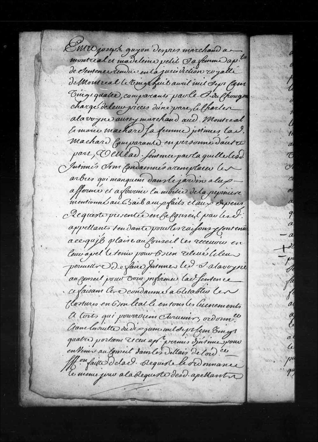 Appel mis à néant de la sentence rendue en la Juridiction de Montréal, le 28 avril 1724, dans la cause de Joseph Guyon Després, marchand à Montréal, et Madeleine Petit, sa femme, contre Charles Alavoine, aussi marchand à Montréal, et Marie Machard, sa femme. «Ayant égard aux offres d'Alavoinelavoine et sa femme mentionnées en l'acte du 15 mai 1725, et aux raisons qui y sont expliquées, les décharge de fournir la moitié de la pépinière mentionnée en la dite sentence même du contenu aux dites offres, faute par les Guyon Després et sa femme de les avoir acceptés dans le temps», 1er juillet 1726, Archives nationales à Québec, Fonds Conseil souverain, (03Q,TP1,S28,P16343).