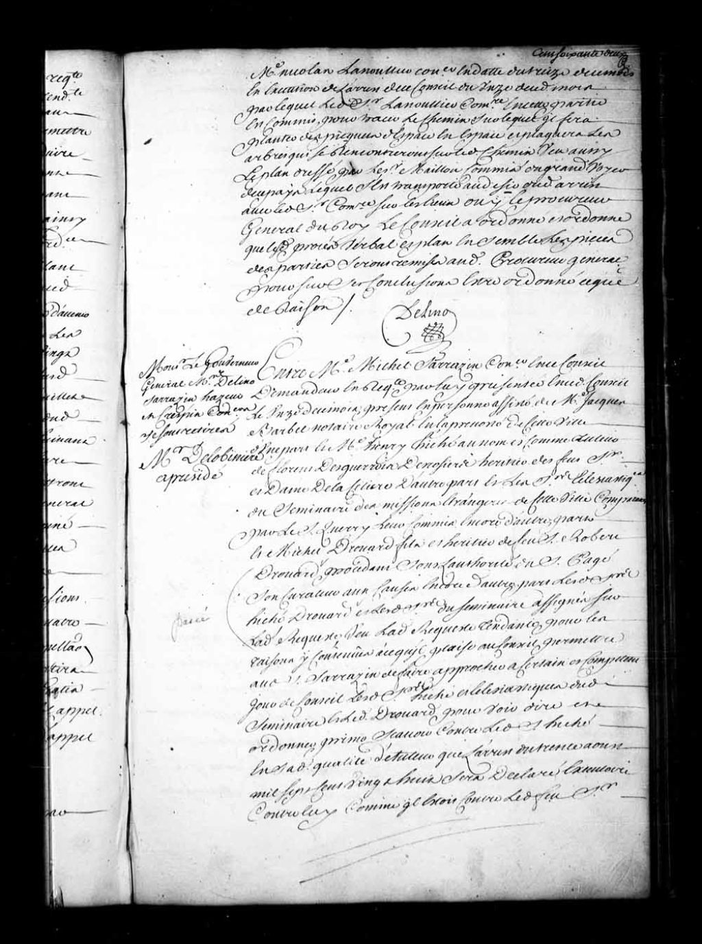 Arrêt qui décide, avant de faire droit sur la requête présentée au Conseil dans la cause entre Michel Sarrazin, conseiller, et Henri Hiché, tuteur de Florent Desguerrois Desrosiers, et les Sieurs Ecclésiastiques du séminaire de Québec, et encore Michel Drouard, fils et héritier de feu Robert Drouard, que le sieur Hiché sera tenu de présenter dans huitaine les papiers dont le feu sieur de LaCetière était chargé, 16 août 1729, Archives nationales à Québec, Fonds Conseil souverain, (03Q,TP1,S28,P16903).