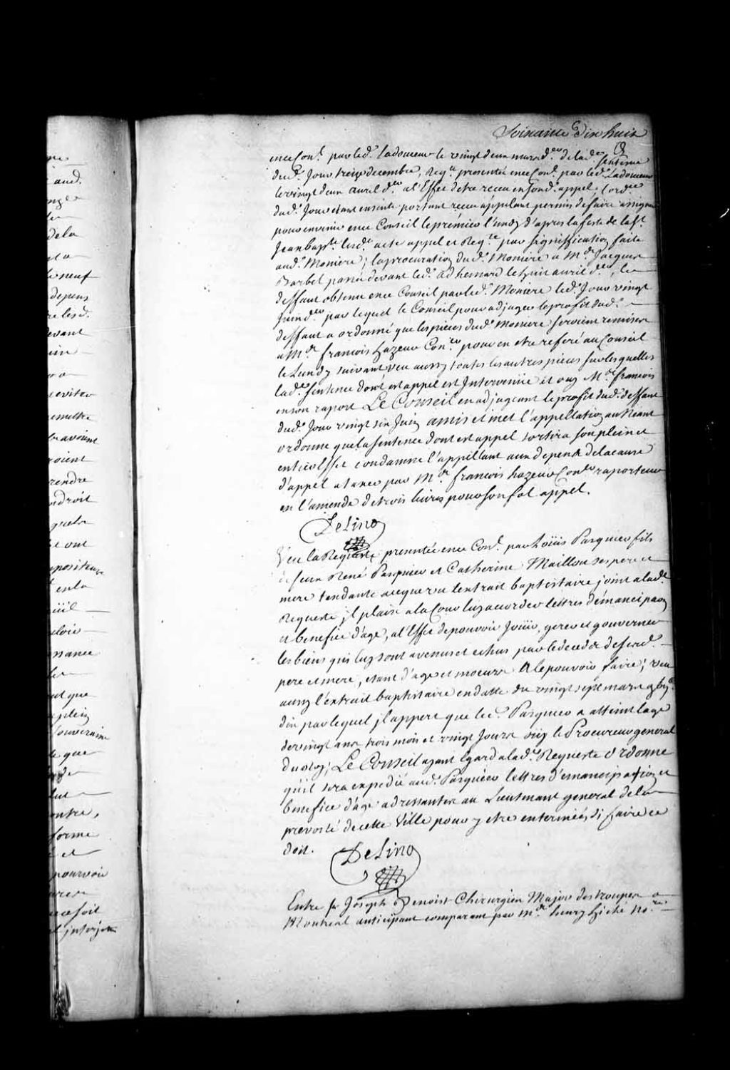 Arrêt qui ordonne d'expédier des lettres d'émancipation et bénéfice d'âge à Louis Pasquier, né le 27 mars 1710, fils de feu René Pasquier et de Catherine Maillou, 17 juillet 1730, Archives nationales à Québec, Fonds Conseil souverain, (03Q,TP1,S28,P17095).