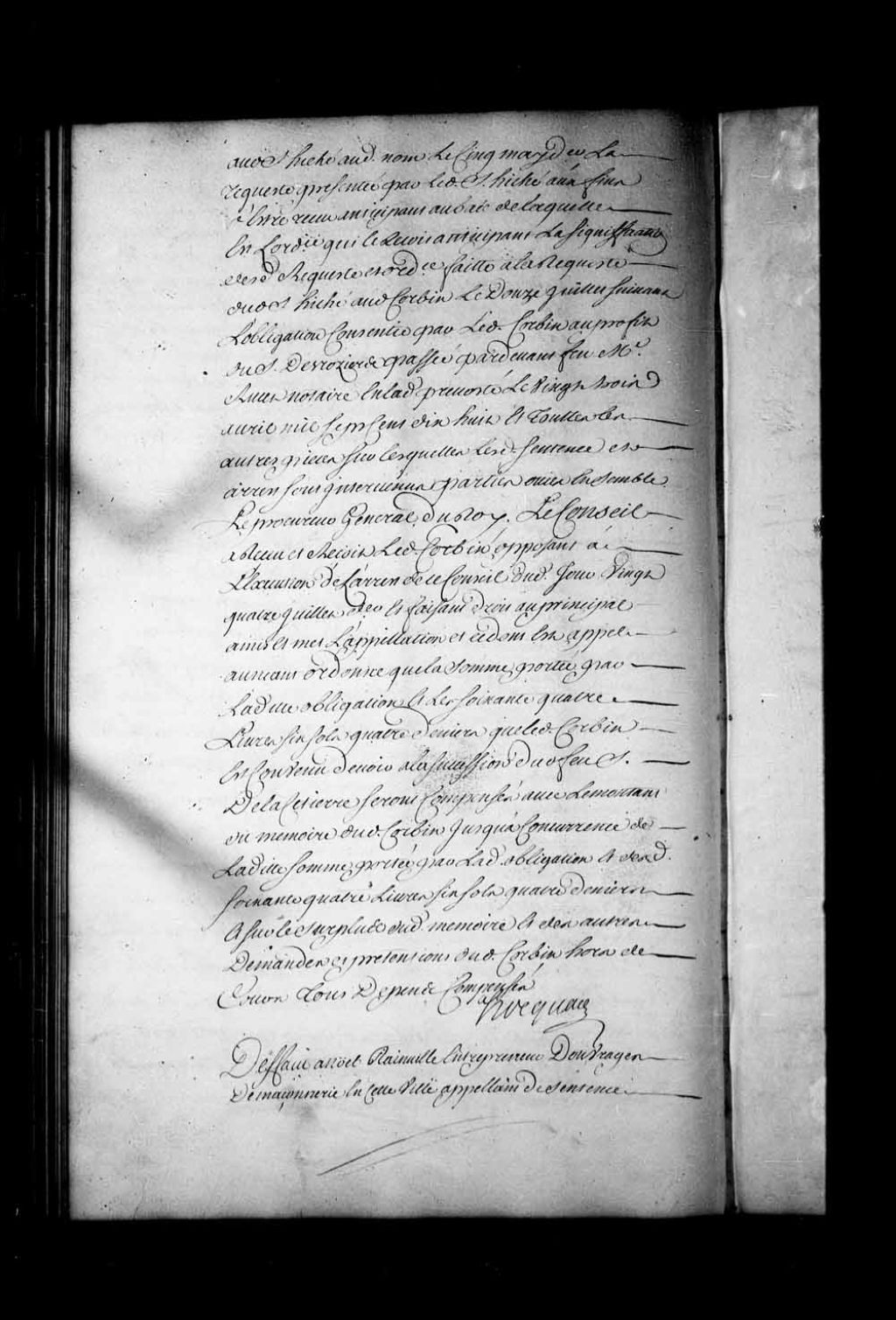 Arrêt qui accorde défaut à Noël Rainville, entrepreneur d'ouvrages de maçonnerie et appelant de la sentence rendue en la Prévôté de Québec, le 28 juillet 1730, contre Marie-Madeleine Roberge, veuve de Charles Perthuis, marchand, 28 août 1730, Archives nationales à Québec, Fonds Conseil souverain, (03Q,TP1,S28,P17139).
