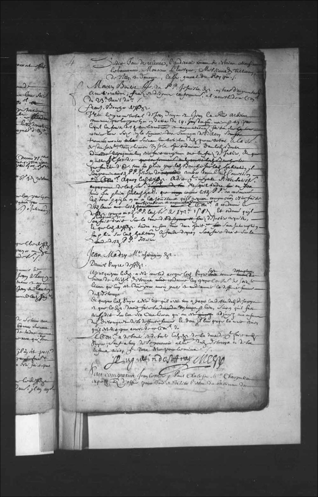 Transcription du texte avec orthographe modernisée : «Sont comparus Jean Lemire et Paul Chalifou maîtres charpentiers experts nommés d'office pour voir et visiter l'état des bâtiments des lieux de Coullonges et d'Argentenay, lesquels ont affirmé par leur serment le procès-verbal par eux fait desdites visites avoir été fait selon la vérité et leur conscience, requérant que taxe leur soit faite. Le Conseil a ordonné et ordonne auxdits Lemire et Chalifou la somme de vingt livres chacun, fait au Conseil souverain tenu à Québec le 21e juin 1664.»