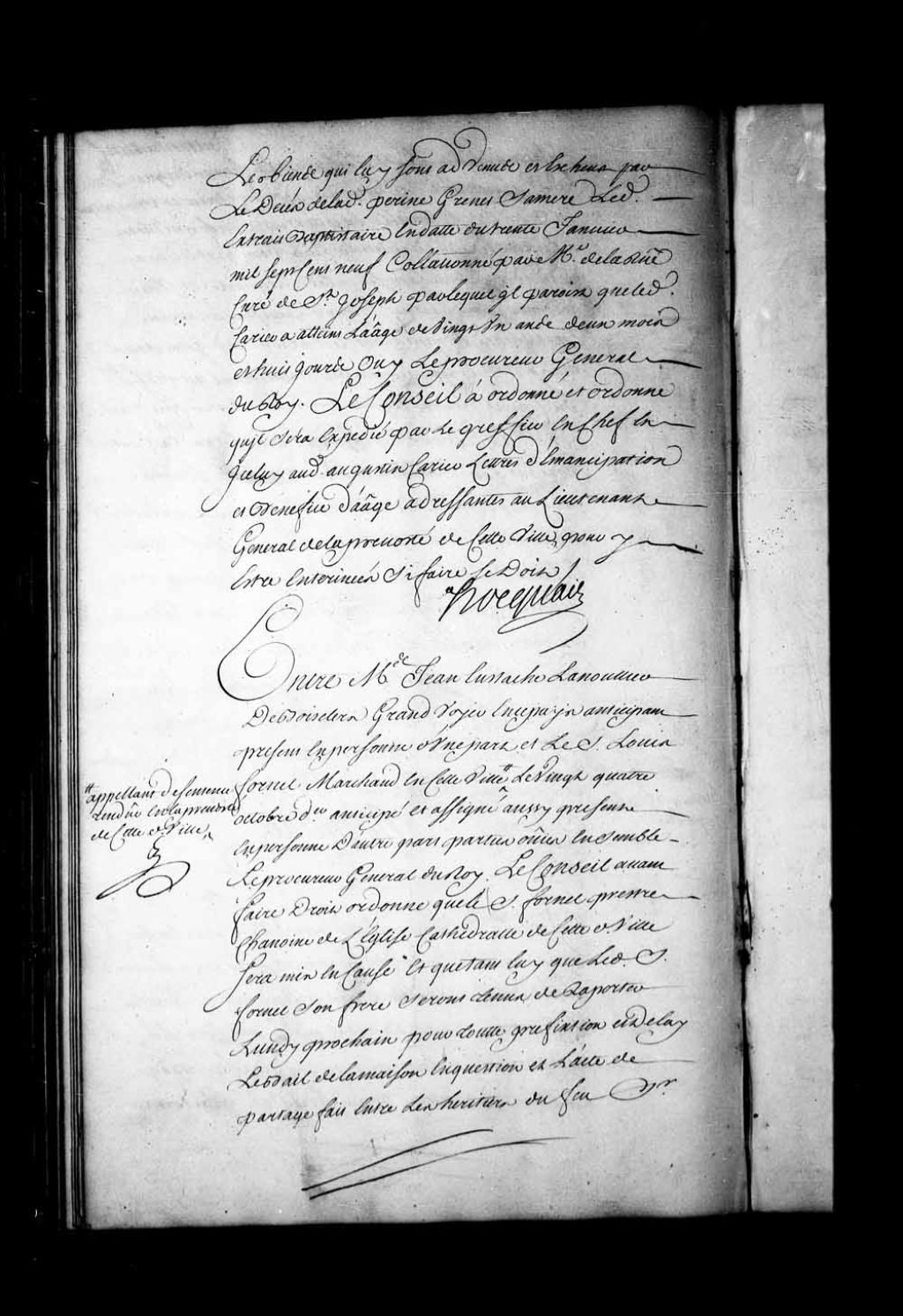 Arrêt qui, avant de faire droit dans la cause entre Jean-Eustache Lanoullier de Boisclerc, grand voyer en ce pays, et Louis Fornel, marchand à Québec et appelant de la sentence rendue en la Prévôté de Québec, le 24 octobre 1730, ordonne que le sieur Fornel, prêtre, chanoine de l'église cathédrale de Québec, sera mis en cause et que tant lui que le dit Fornel, son frère, seront tenus de rapporter au Conseil le bail de la maison en contestation et l'acte de partage fait entre les héritiers du feu sieur Fornel, leur père