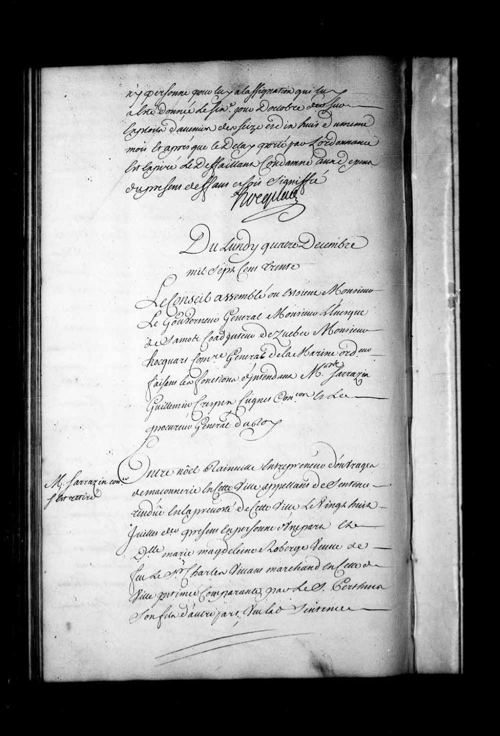 Appel mis à néant de la sentence rendue en la Prévôté de Québec, le 28 juillet 1730, dans la cause entre Noël Rainville, entrepreneur d'ouvrages de maçonnerie, et demoiselle Marie-Madeleine Roberge, veuve de Charles Perthuis, marchand à Québec, 4 décembre 1730, Archives nationales à Québec, Fonds Conseil souverain, (03Q,TP1,S28,P17178).