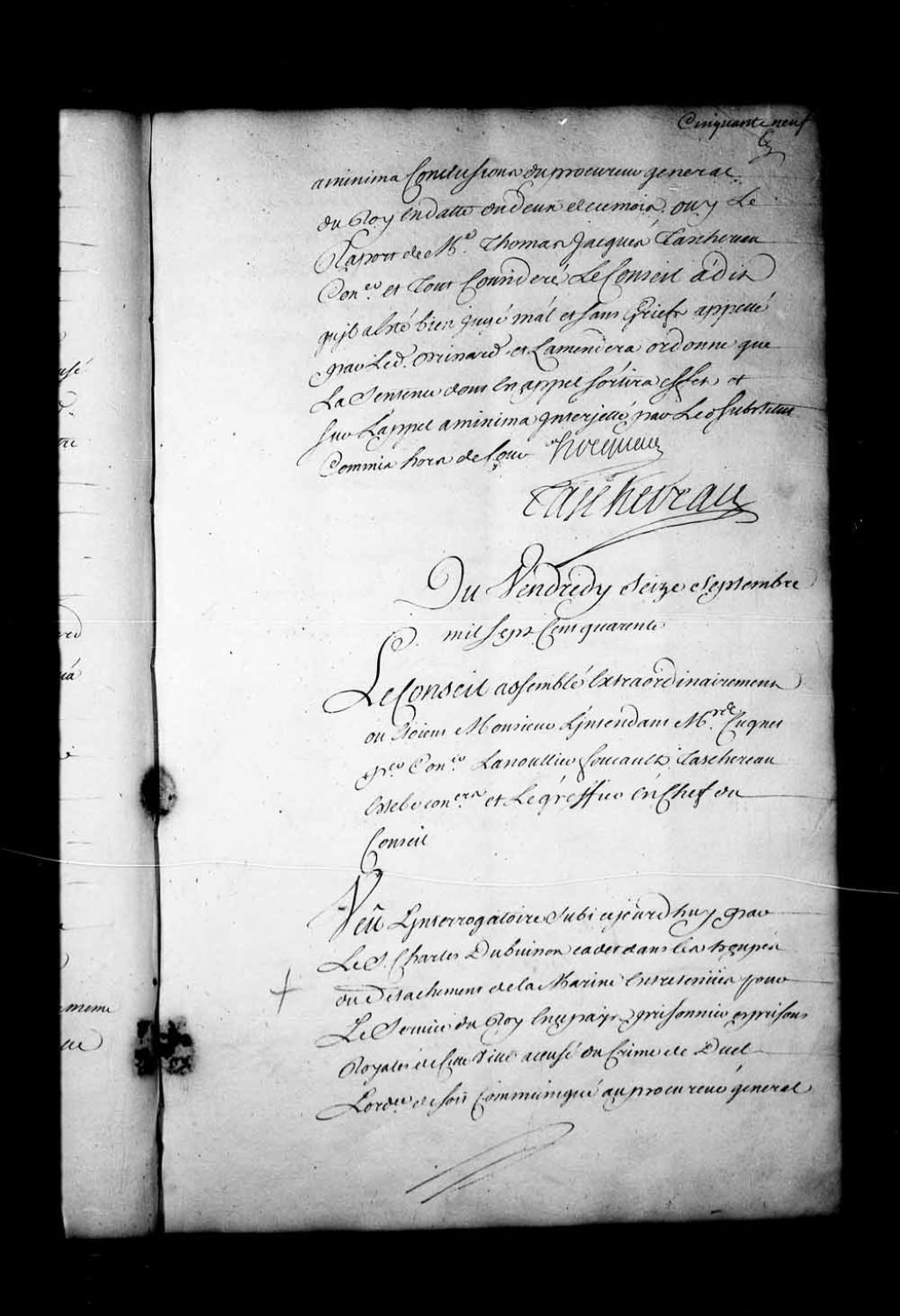 Ordonnance visant à ce que les propos de Charles Renaud Dubuisson, cadet dans les troupes du détachement de la Marine, et Joseph Caron, au nom de la mémoire de curateur de feu Cournoyer de Chambly, accusés de crime de duel, seront confrontés à sa déclaration du 31 janvier 1736 et également confrontés aux propos émis, le 16 janvier 1738, par Joseph Caron, curateur de la mémoire de Cournoyer de Chambly, 16 septembre 1740, Archives nationales à Québec, Fonds Conseil souverain, (03Q,TP1,S28,P17254).