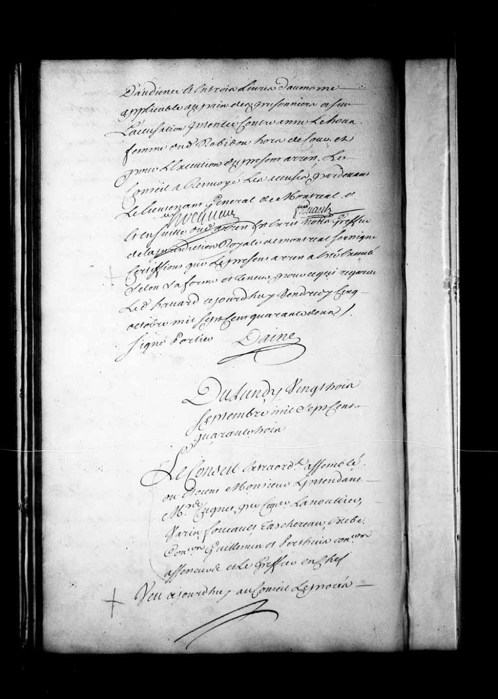 Appel mis au néant de la sentence rendue, le 12 septembre 1743, dans la Juridiction des Trois-Rivières, contre Étienne Mousslet dit Sansoucy et vulgairement appelé «Minoche», homme vagabond, accusé de vol de linges, notamment dans la maison de Romain Dubuc, habitant de Champlain. Condamné à être battu et fustigé nu sur la place publique des Trois-Rivières, à porter un ceriseau (écriteau) mentionnant : «Voleur de linges et hardes », marqué au fer de la fleur de lys sur l'épaule droite et banni pour une période de 9 années de la colonie, 23 septembre 1743, Archives nationales à Québec, Fonds Conseil souverain, (03Q,TP1,S28,P17262).