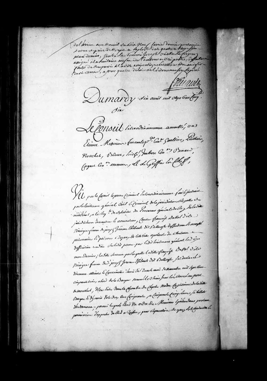 Appel mis à néant de la sentence rendue, le 10 mars 1756, contre Françoise Duval dit Vinaigre, femme de Joseph-Jérôme Thibault dit Bellerose, accusée d'avoir volé en novembre 1753, dans la chambre du capitaine Charles Nadeau, à bord de la barque «la Saint-Jean», 250 livres en billets d'ordonnances. Françoise Duval dit Vinaigre est condamnée à être bannie à perpétuité de la colonie, 6 avril 1756, Archives nationales à Québec, Fonds Conseil souverain, (03Q,TP1,S28,P17358).