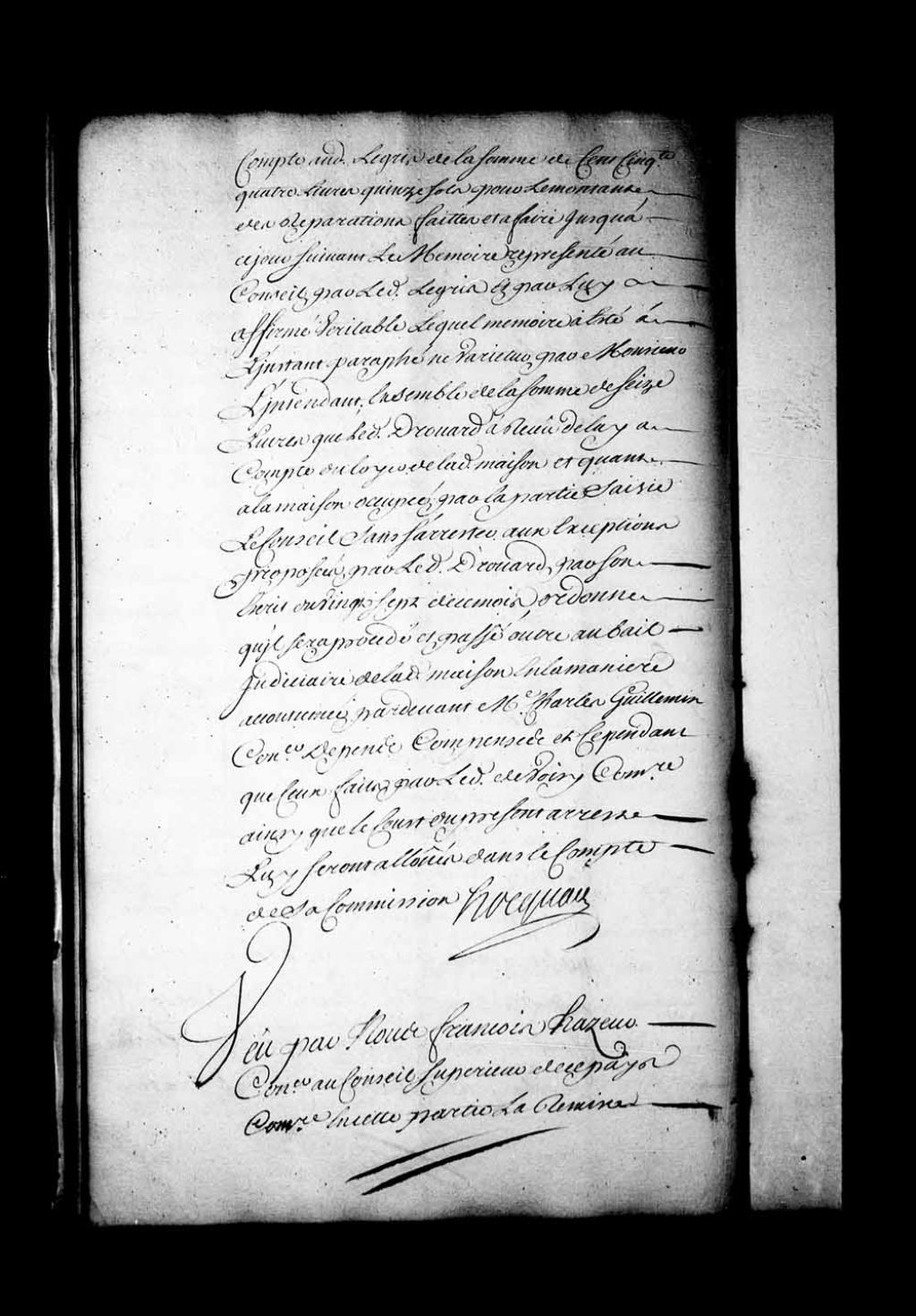 Enchère d'un emplacement et maison situés sur les rues Cul-de-sac et Champlain, Jean Lemoine poursuivant la vente. Ne s'étant trouvé d'enchérisseur à la dernière enchère de 3 700 livres, la vente est remise à plus tard, 28 avril 1732, Archives nationales à Québec, Fonds Conseil souverain, (03Q,TP1,S28,P17606).