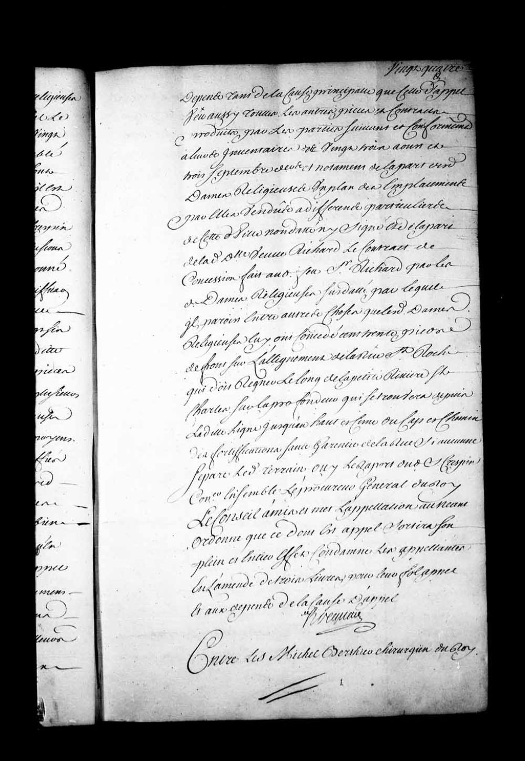Arrêt qui ordonne que les pièces des parties seront remises à Jean Crespin (Crépin), conseiller, dans la cause entre Michel Berthier, chirurgien du Roi à Québec, tant en son nom, comme époux de Marie-Anne Denys de Saint-Simon que comme tuteur des mineurs de feu Théodose Denys de Vitré, appelant de la sentence rendue en la Prévôté de Québec, le 18 novembre 1732, et dame Louise-Madeleine dePeiras, veuve de Paul Denys de Saint-Simon, conseiller au Conseil Supérieur de ce pays, 24 novembre 1732, Archives nationales à Québec, Fonds Conseil souverain, (03Q,TP1,S28,P17713).