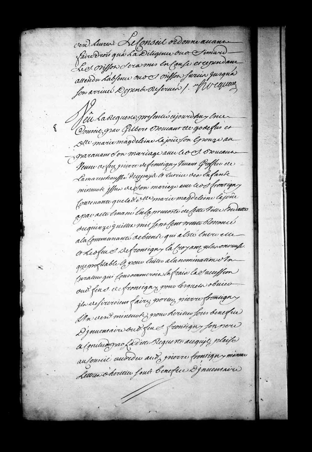 Arrêt qui ordonne, que par le greffier en chef du Conseil, qu'il sera expédié à Gilbert Boucault de Godefus et Marie-Madeleine Lajoue, son épouse, auparavant veuve de Pierre de Frontigny, greffier de la Maréchaussée, des lettres d'héritier sous bénéfice d'inventaire du dit de Frontigny, 6 juillet 1733, Archives nationales à Québec, Fonds Conseil souverain, (03Q,TP1,S28,P17811).