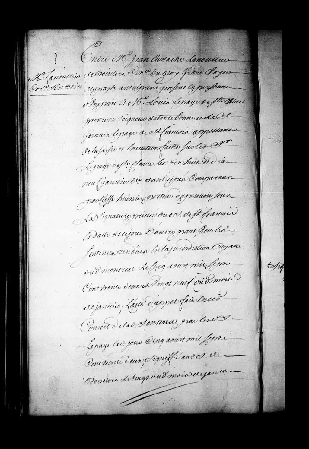 - Appel mis à néant de la saisie et exécution faites, les 18 et 19 janvier 1734, dans la cause entre Jean-Eustache Lanouillier de Boisclerc, grand voyer, contre Louis Lepage de Sainte-Claire, prêtre et seigneur de Terrebonne, et Germain Lepage de Saint-François