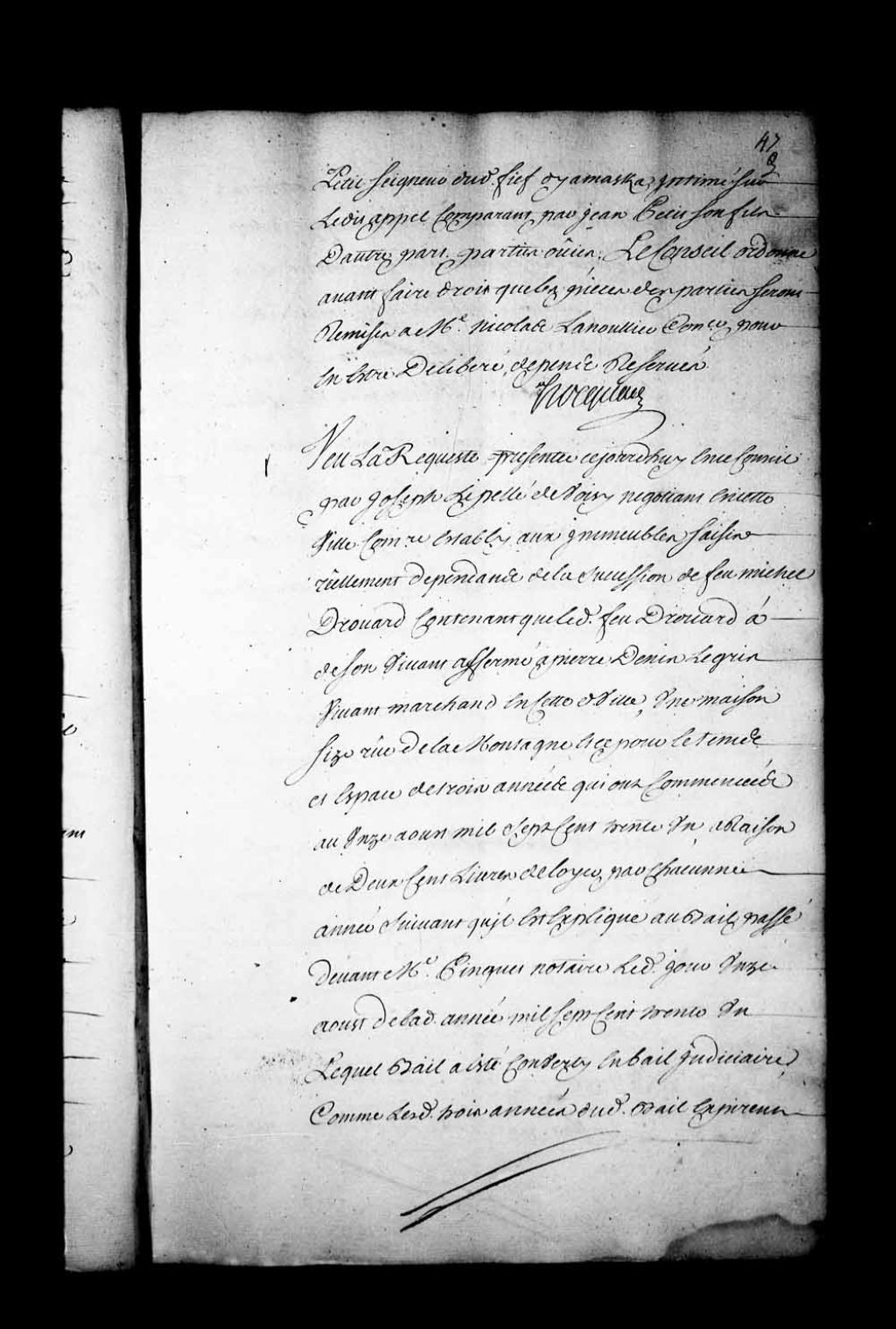 Arrêt qui commet Charles Guillimin, conseiller, pour procéder au bail judiciaire de la maison saisie sur la succession de Michel Drouard, 2 août 1734, Archives nationales à Québec, Fonds Conseil souverain, (03Q,TP1,S28,P17999).