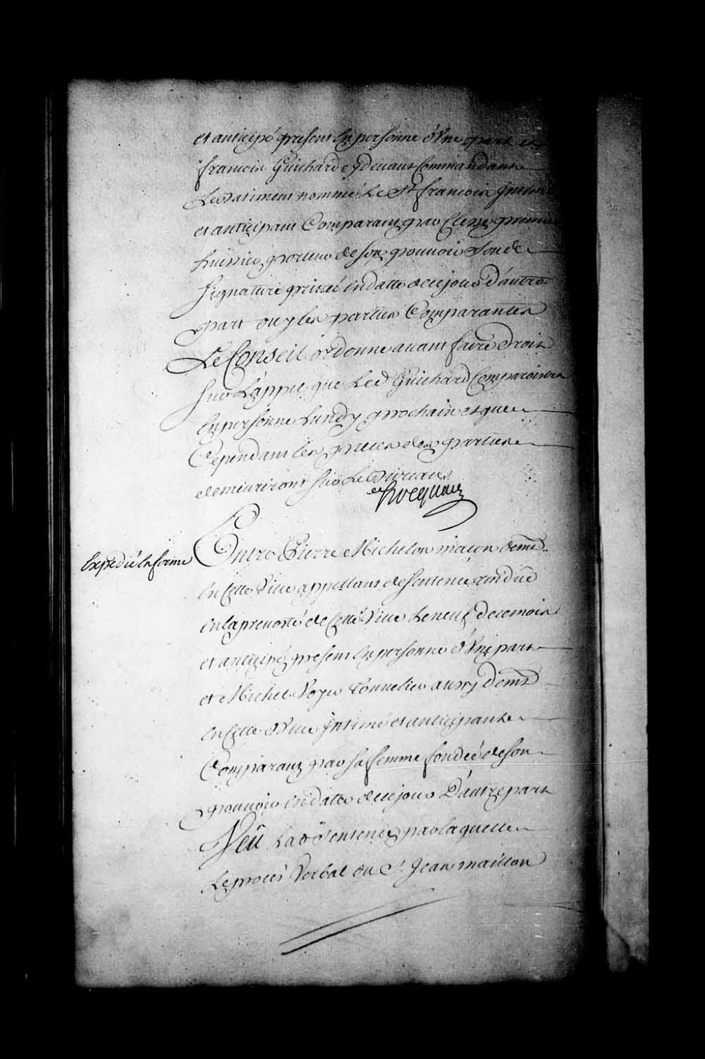 Appel mis à néant dans la cause entre Pierre Michelon, maçon, de Québec (appelant de la sentence rendue en la Prévôté du 9 de ce mois) et Michel Voyer, tonnelier, aussi de Québec; émendant, ordonné que les parties cloront mitoyennement en pieux et à frais communs suivant l'usage et où le dit Voyer voudrait faire un mur de clôture le pourra, etc.. etc, 22 août 1735, Archives nationales à Québec, Fonds Conseil souverain, (03Q,TP1,S28,P18193).