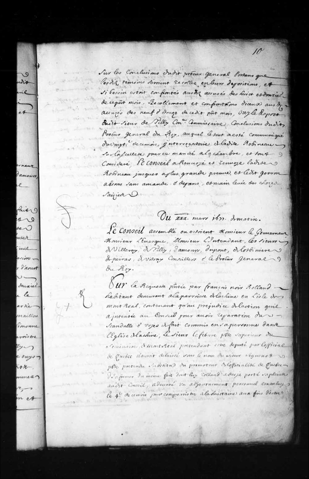 - Transcription du texte avec orthographe modernisée : «Du 30e mars 1677 de matin. Le Conseil assemblé où étaient Monsieur le gouverneur, Monsieur l'évêque, Monsieur l'intendant, les sieurs de Villeray, de Tilly, Damours, Dupont, de Lotbinière, Depeiras, de Vitré conseillers et le procureur général du Roi. Sur la requête présentée par François Noir Rolland habitant demeurant à la paroisse de Lachine en l'île de Montréal contenant qu'au préjudice de l'action qu'il a intentée au Conseil pour avoir réparation du scandale et voies de fait commis en sa personne dans l'église de Lachine, le sieur Lefebvre prêtre supérieur du séminaire de Montréal prétendant être député par l'official de Québec n'aurait délaissé sous le nom du sieur Seguenot prêtre prétendu substitut du promoteur de l'officialité de Québec d'informer du même fait dont lui Rolland a déjà porté sa plainte audit conseil, a décerné un ajournement personnel contre lui le 4e de ce [...]